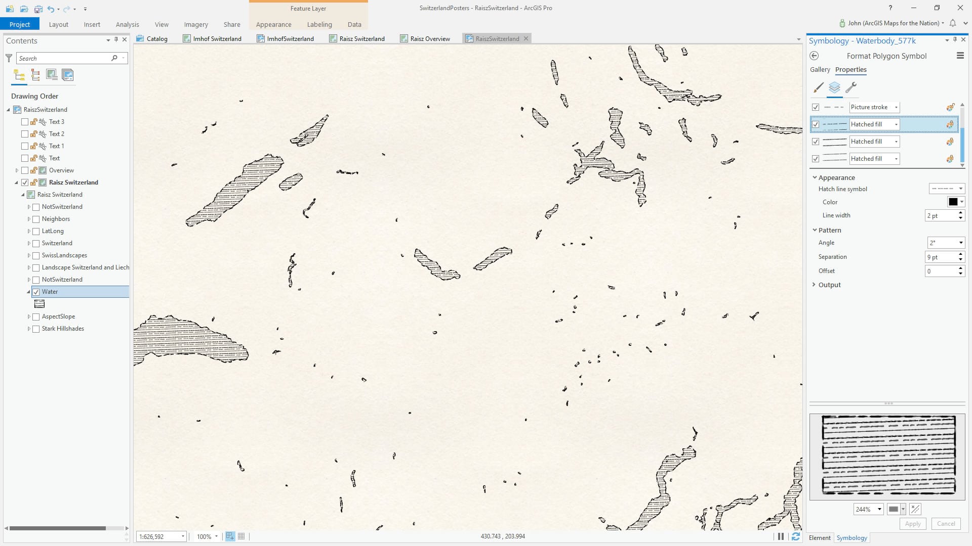 Raisz’s water fills are commonly constructed of dense horizontal (not quite horizontal -I notice he often aligned his hatch strokes to the graticule. What a magnificent detail). I started with a picture stroke line symbol, which I then pull into a hatched fill line pattern. I made three versions of the line stroke, and applied each as a hatched fill pattern to add some variability, offset so they don’t overlap each other.