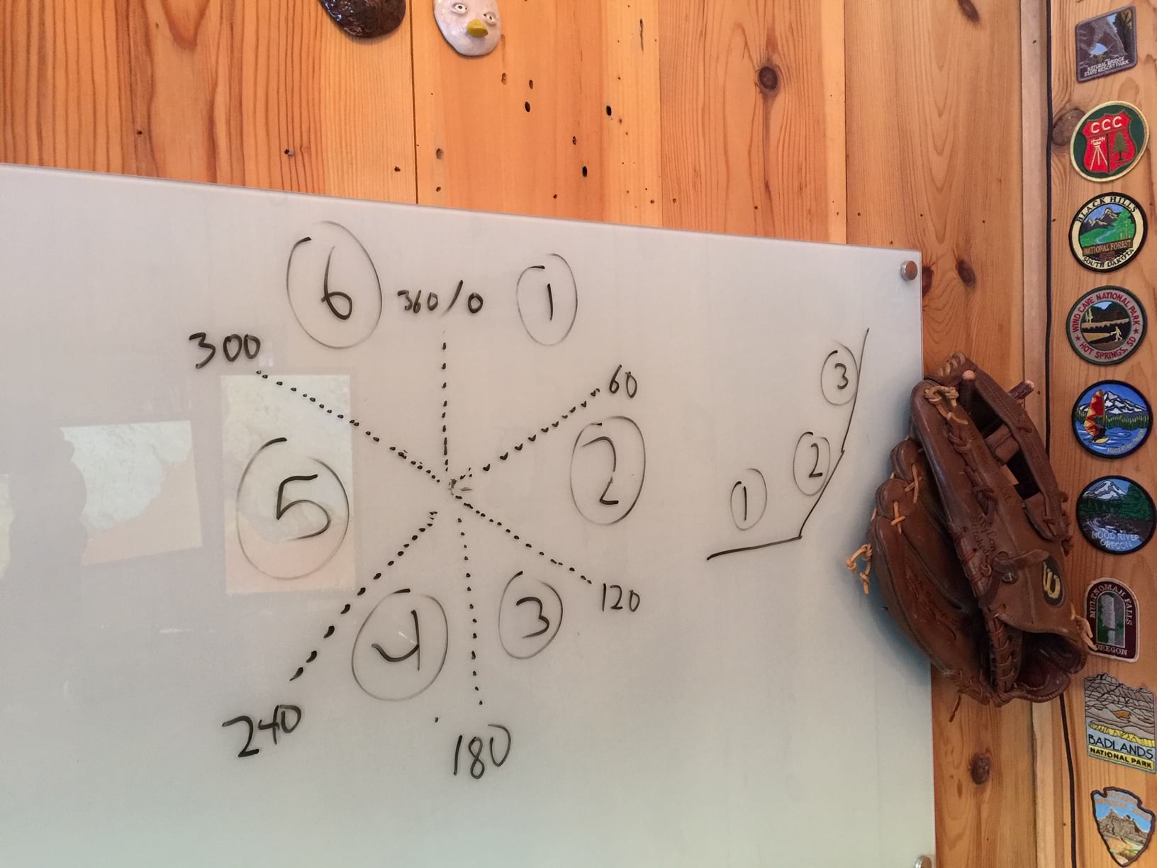 Here’s a look at my white-boarded geoprocessing plan for this bit. The angles for six discrete aspect ranges and three levels of steepness. Oh, oops, did some pottery, patches, and a left-handed mitt get in there?