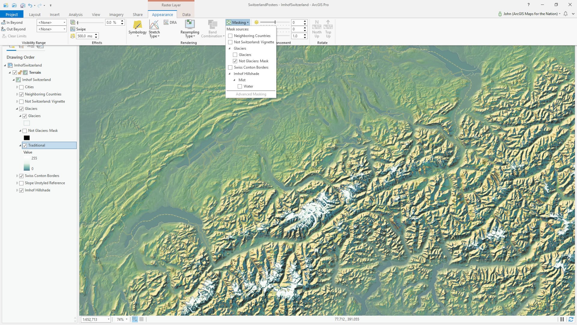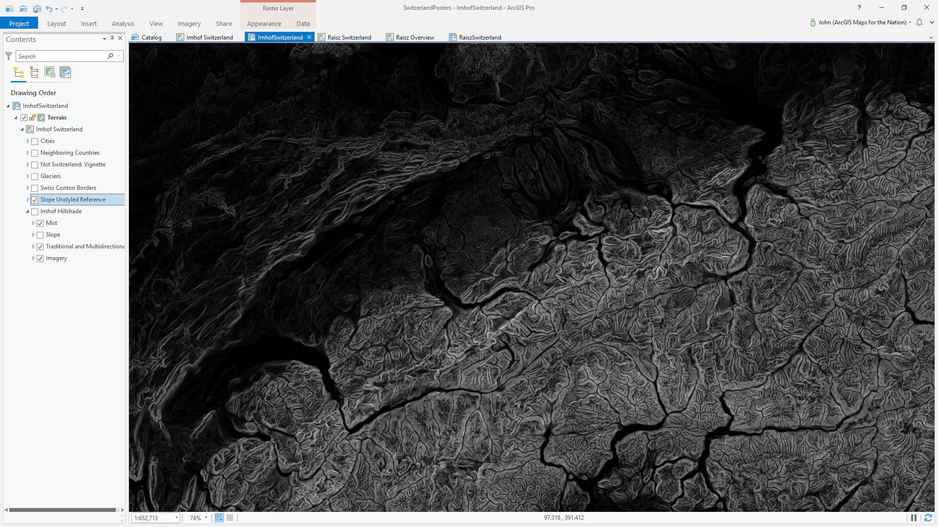 The standard method of using the Imhof style for Pro is applying a special hillshade gradient to both a traditional hillshade layer and a multidirectional hillshade layer, then applying a special mist gradient to the source DEM (and some imagery under it all and some styled up water vectors under the mist). If you are familiar with this style, there’s no surprises here. Looks like this: