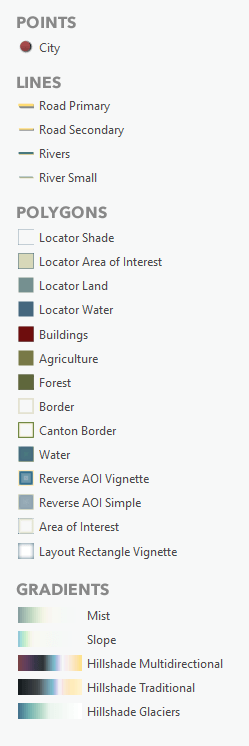 I wanted to include city points and labels to this map so I looked at the various point symbols Imhof used in his maps. I saw some instances that had a sort of minimal 3D effect with a faint offset shadow. I recreated this in ArcGIS Pro by giving a circle symbol a linear gradient color that shifted from a lighter red at top to a deeper red at bottom. The I duplicated the symbol, moved it down and to the right, and gave it a shade-like fill of semi-transparent black to a more opaque black. You can see me do something similar in this video. I have included this symbol in the Imhof style, so you can have access to it.