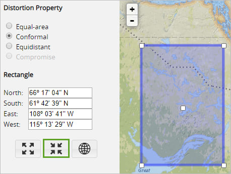 5. Visit the Projection Wizard. This handy tool (created by Bojan Šavrič) will suggest a custom projection for you based on your desired extent and distortion property. You don’t need to know how to create projections, you just need to know what you want.
