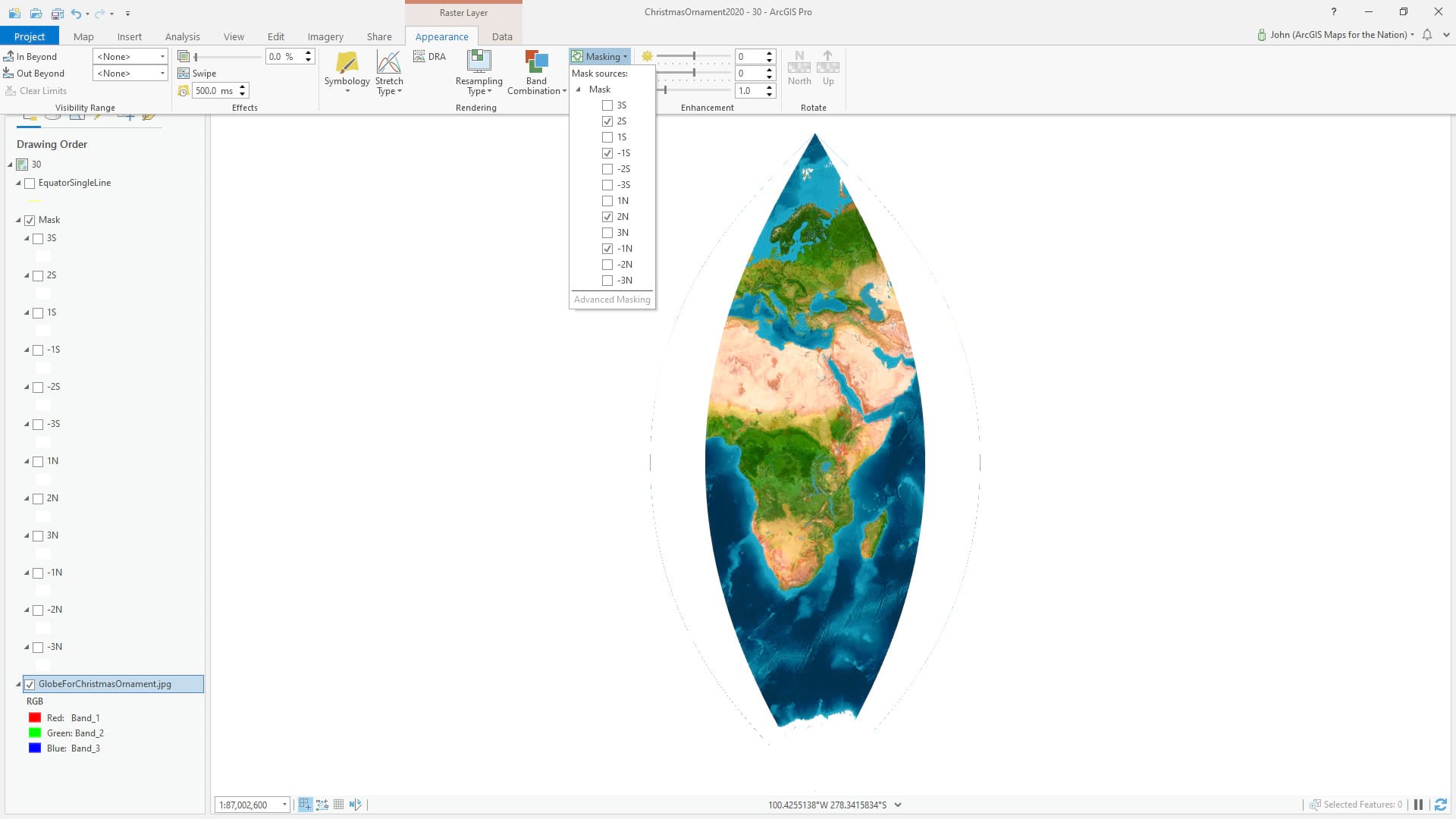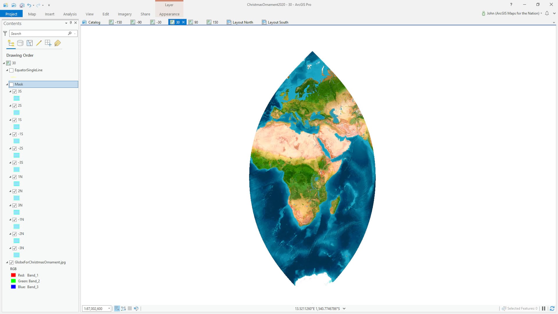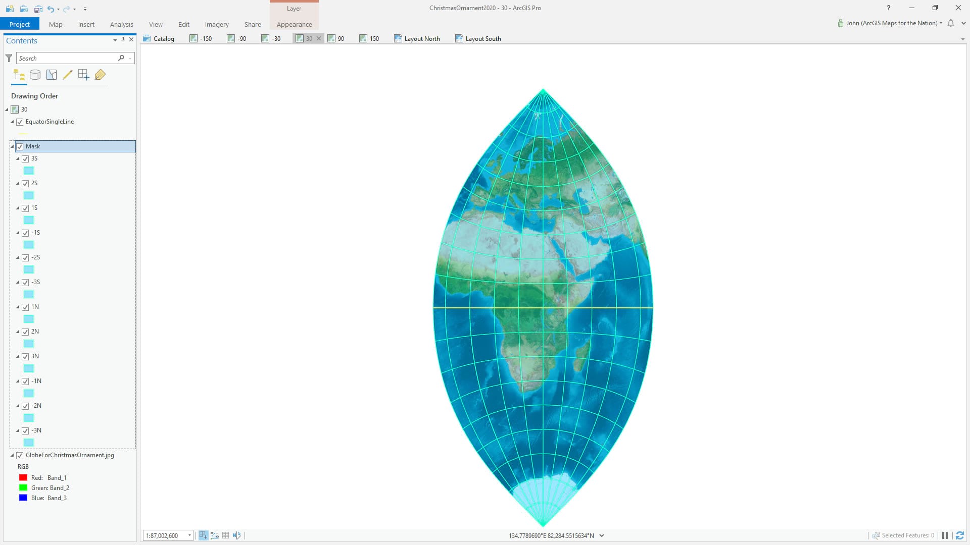 Ok, my friends, that’s all there is to it! If you’d like to open up my source Pro project, I’ve packaged it up for you here. You can apply your own cartography. Speaking of cartography, this ornament is a mini-version of a giant 8-foot globe Esri just installed on campus (more about that insanely fun project later)!