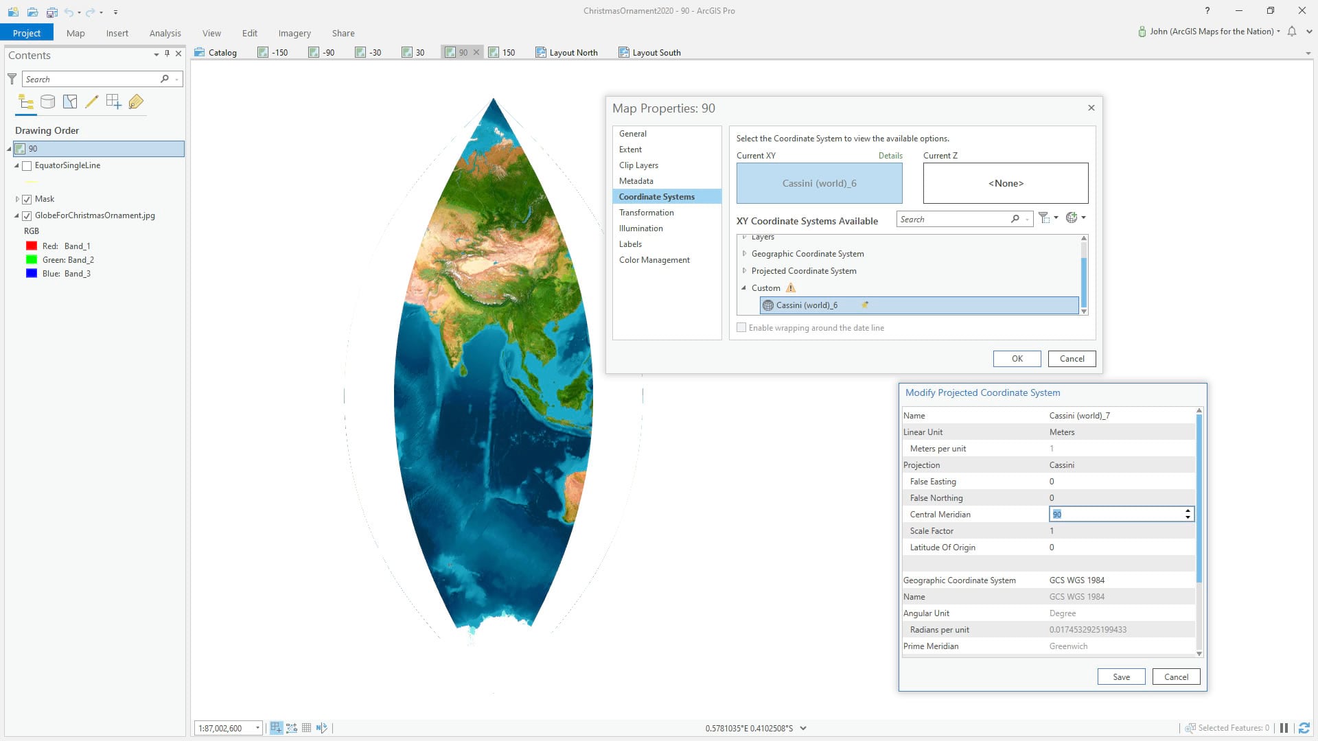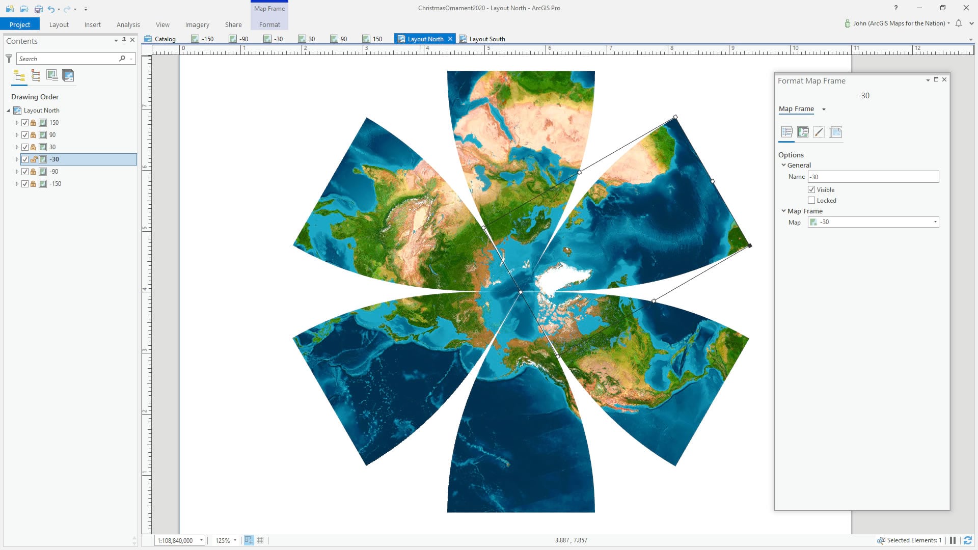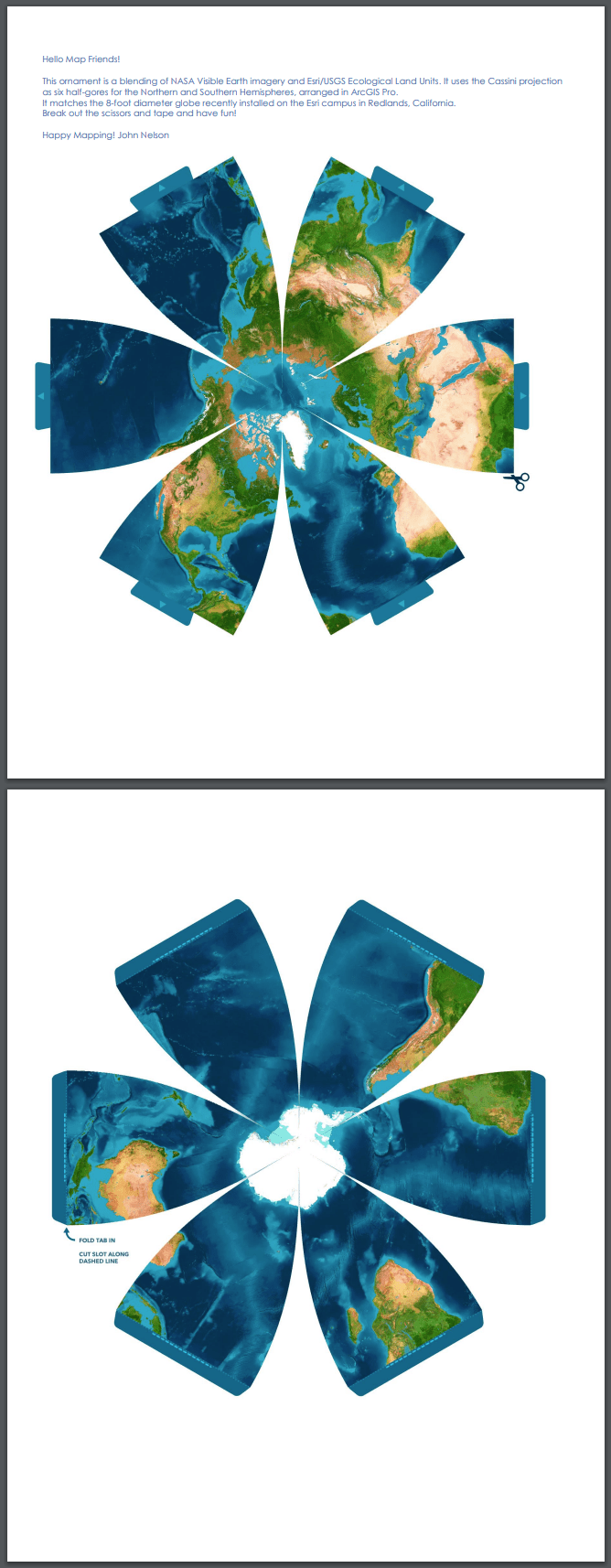The ornament template was created in ArcGIS Pro. I’d been wanting to play around with creating globe gores in Pro for a while so this was a perfect excuse. I consulted with Esri’s resident geodesic genius Bojan Šavrič, and he suggested a couple projections to try for creating the gores. I went with Cassini. Oh, he also insisted I go with 12 gores instead of 6 because it would result in a rounder globe but he is a geodessist so of course he’d want more gores. I’m lazy so I went with 6.