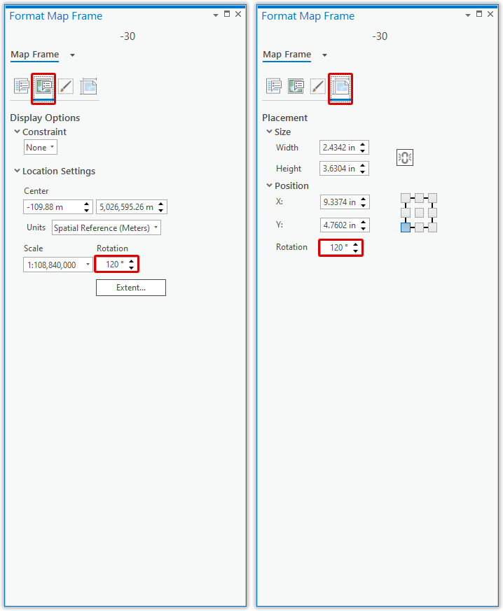 You can set the rotation of the map frame, but the map within it stays un-rotated. So you set the angle in two places to rotate the map frame and the map itself, to the same desired angle. You do this to each map view, with the desired angle (I had 6 gores so it was increments of 60°). Check it…