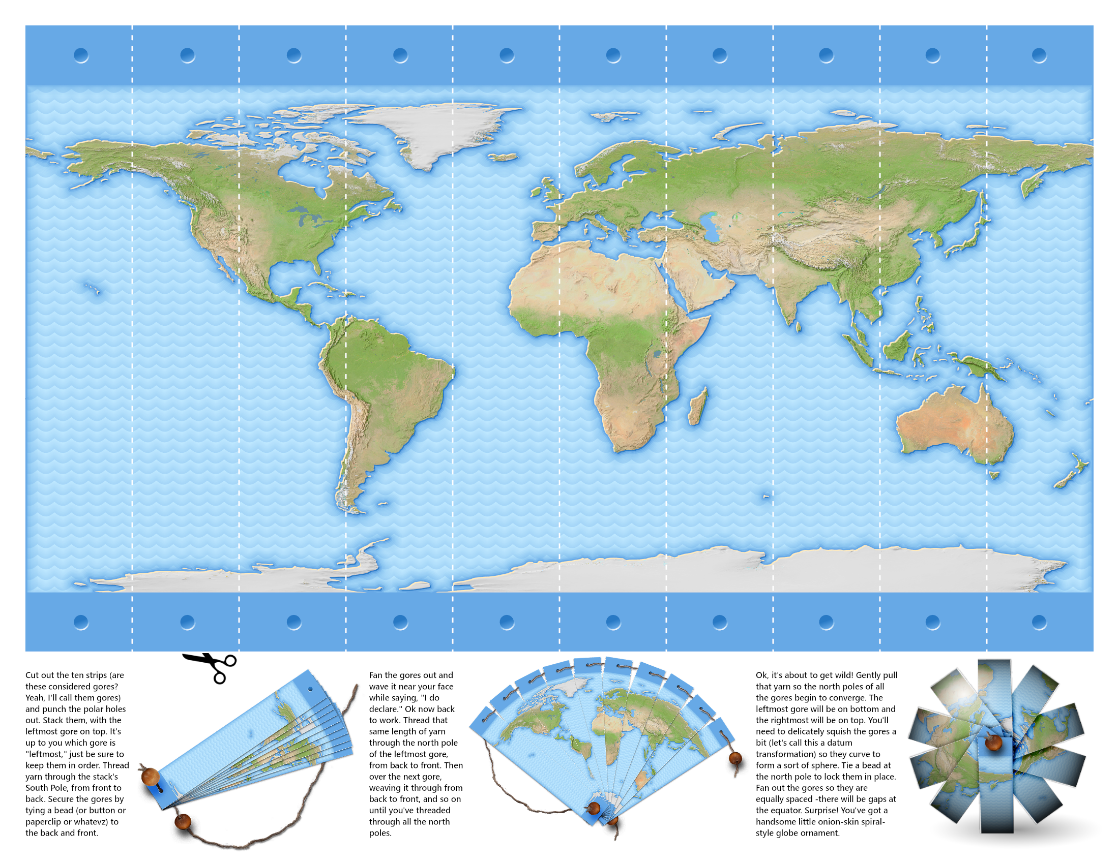 Ah the winter season is a time when we can slow down and appreciate the things that really matter. A chance to take stock of lasting joy. Clearly I’m talking about the opportunity to print out this paper craft ornament template, cut out the component globe gore panels, and assemble them into a simple treasure.