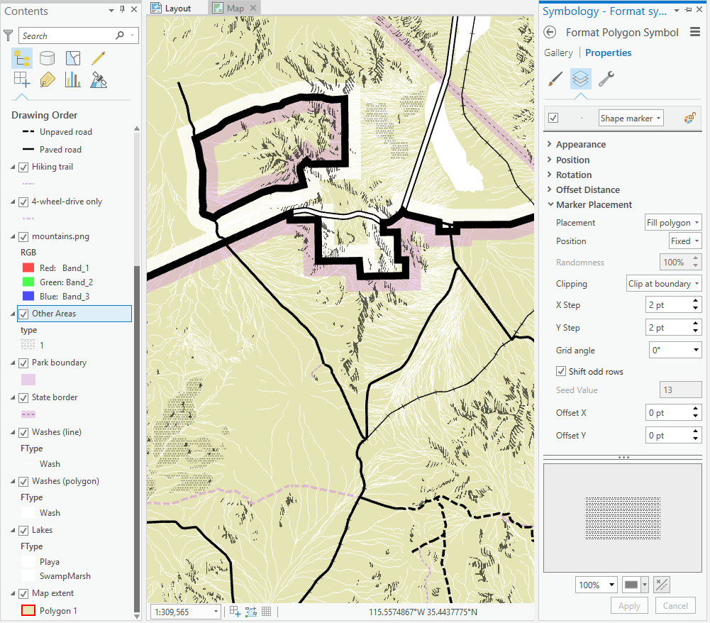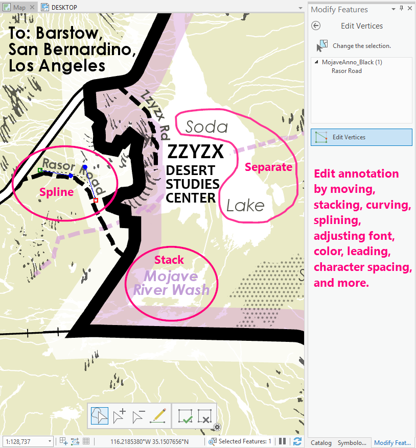 This tutorial uses the example of my map of the Mojave to outline a process for making one of your own, from data hunting all the way down to printing. It uses ArcGIS Pro, and does not go into detail about how to accomplish every single step, but instead gives an overview of the steps you might take. The screenshots provide hints, but ArcGIS Pro Help provides true help.