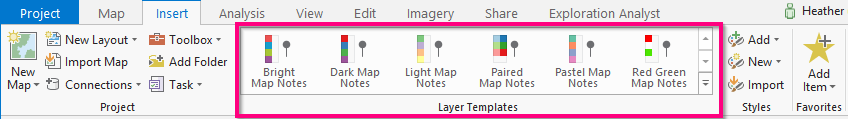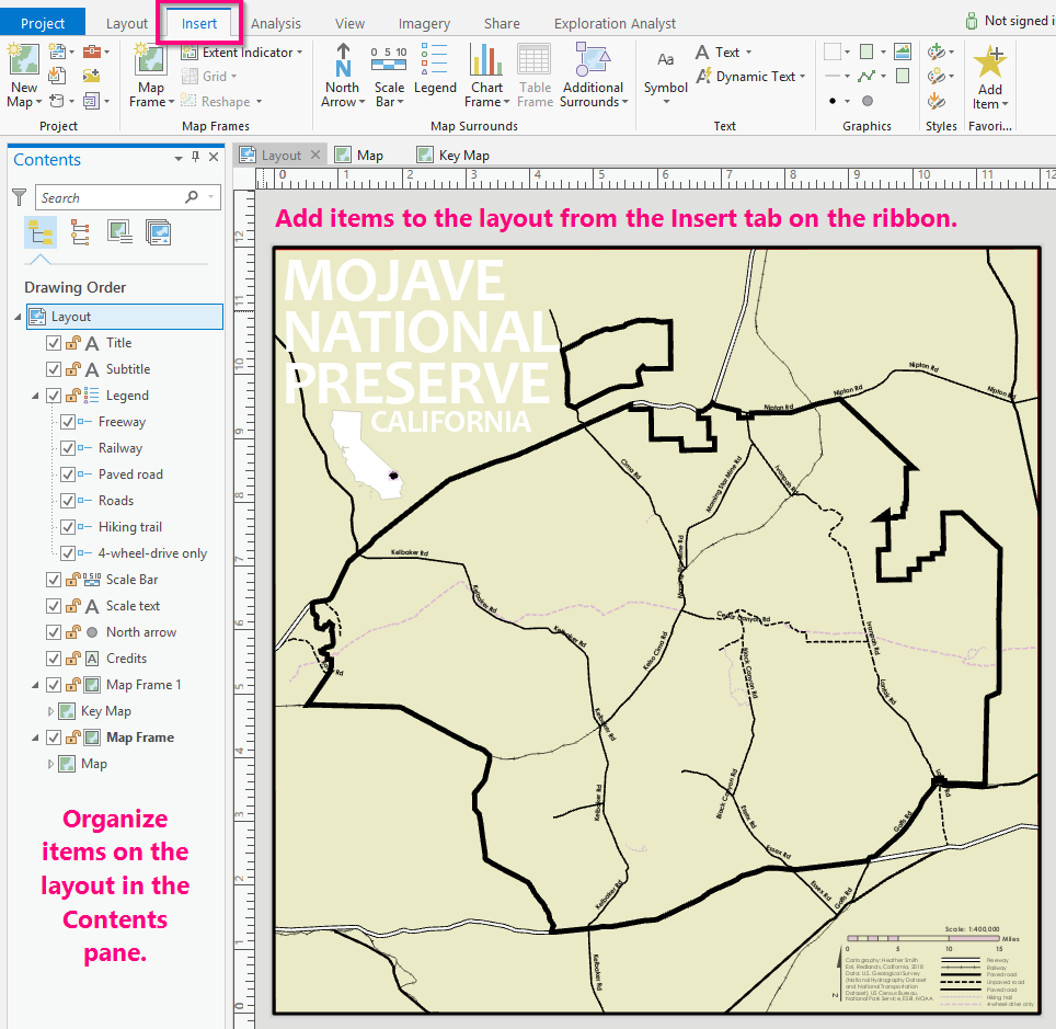 - Insert various items to your layout and style them. Some items you might consider include title, legend, scale bar, north arrow, grid or graticule, border, source credits, descriptive text, pictures, charts and graphs.