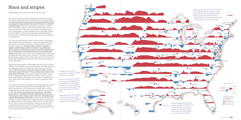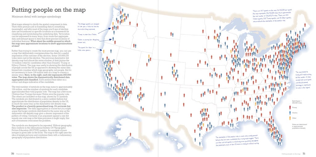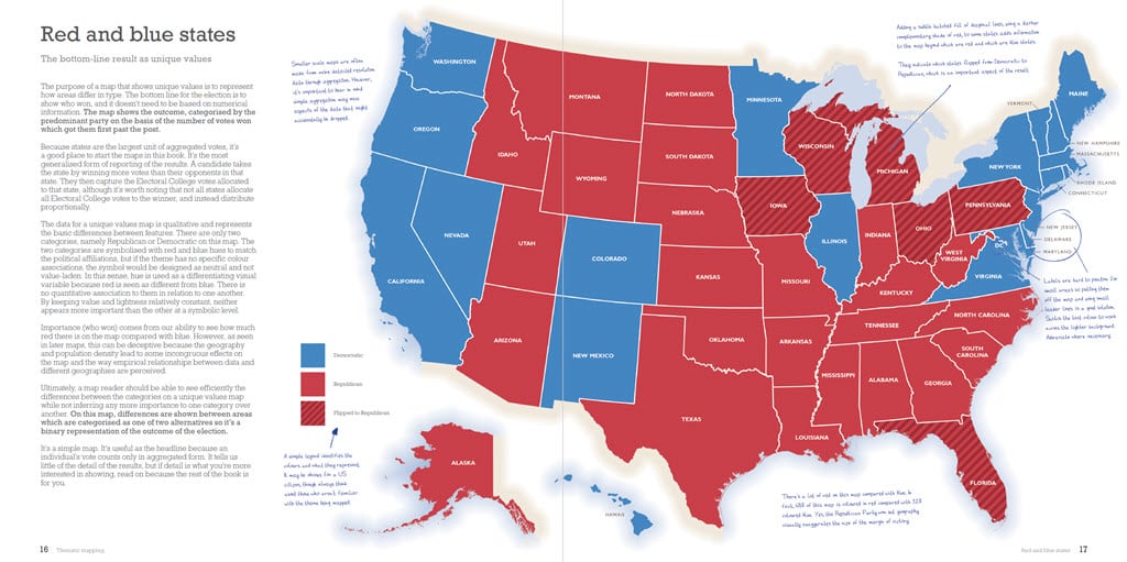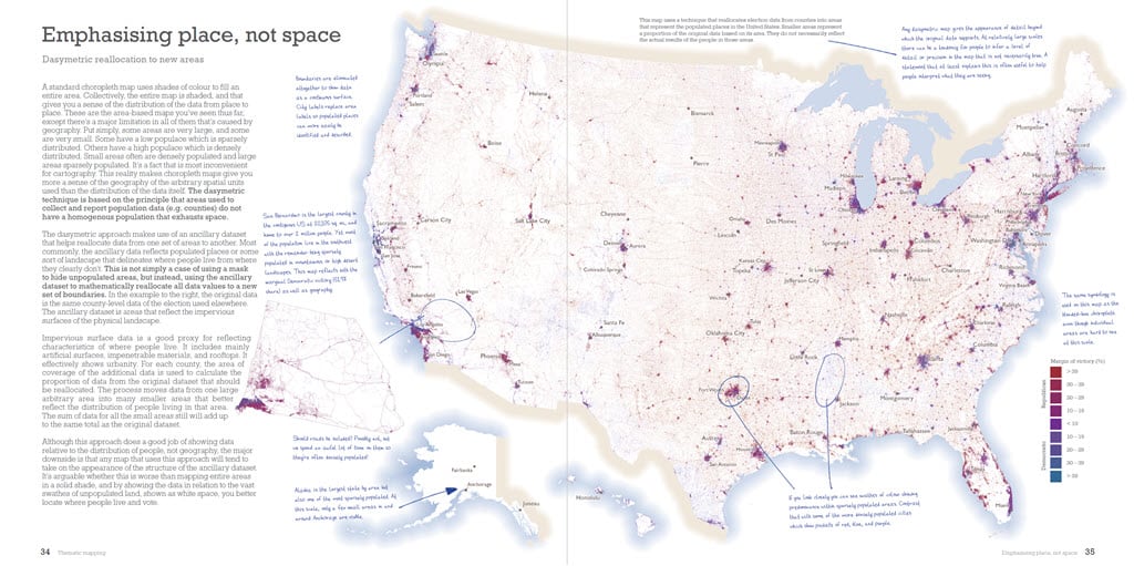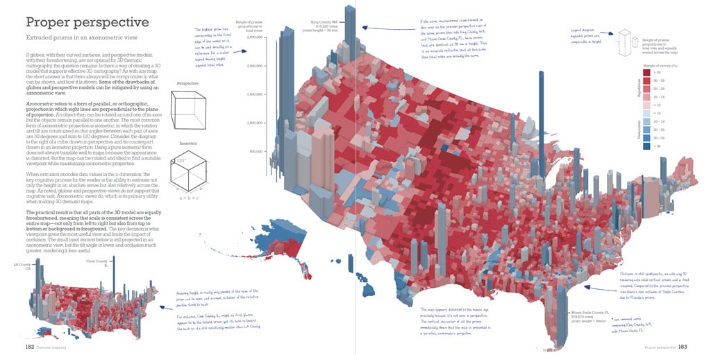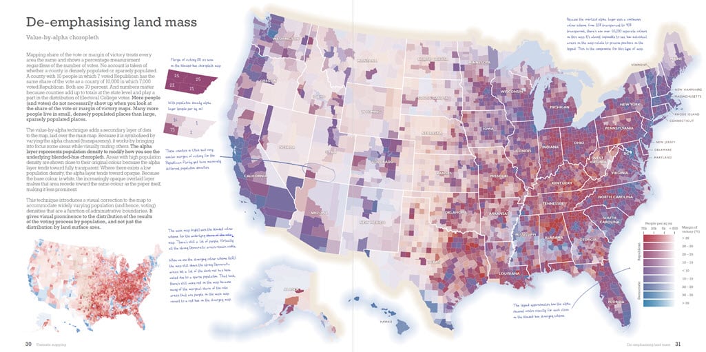 The book is also designed to be suitable for any introductory course on thematic mapping or as a text that supports that content in a broader course on cartography, geography, or GIS. If you happen to be a political scientist, or simply interested in how election data can be seen through different lenses, then you’ll find copious examples that illustrate how maps mediate the message.