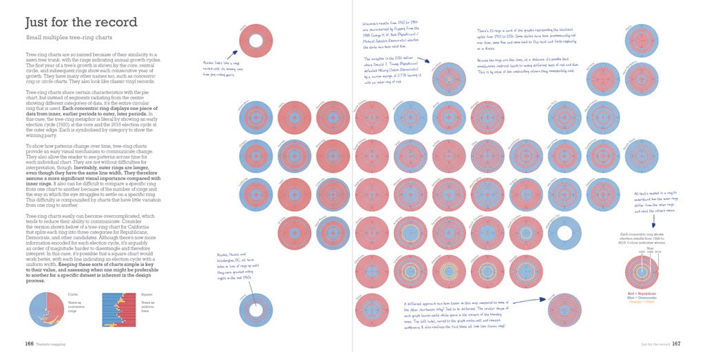 Away from the purely cartographic realm, there are plenty of additional excellent books that explore the role and design of information graphics more widely, such as Cairo’s own books. His latest, How Charts Lie, encourages people to become smarter about visual information. Most similarly themed books attempt to do the same, such as the practical advice in Andy Kirk’s Data Visualisation (2nd ed., 2019) and Edward Tufte’s range of books on conceptual ways to display quantitative information. I also have this aim in mind, for it isn’t just about sharing knowledge and advice on how to make a better map but also better enabling people to read maps. It marries concept and practice, cartography and design, and focuses on maps as a core part of the wider field of information communication. In fact, there’s a whole chapter on charts, graphs and plots, as well as another on using charts on maps.
