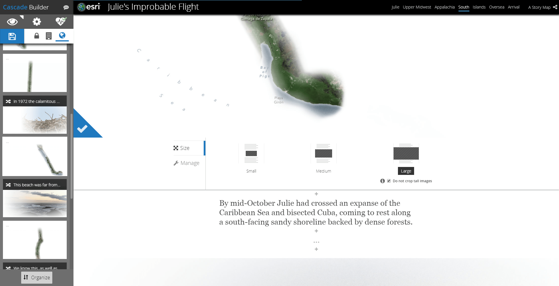 About the tallness of the maps. I wanted to make readers feel a tiny bit of the scale that Julie covered in her migration. Yes, there’s an awful lot of scrolling in the story map, but that action reinforces a sense of distance, tricking readers into feeling a sense of scale.
