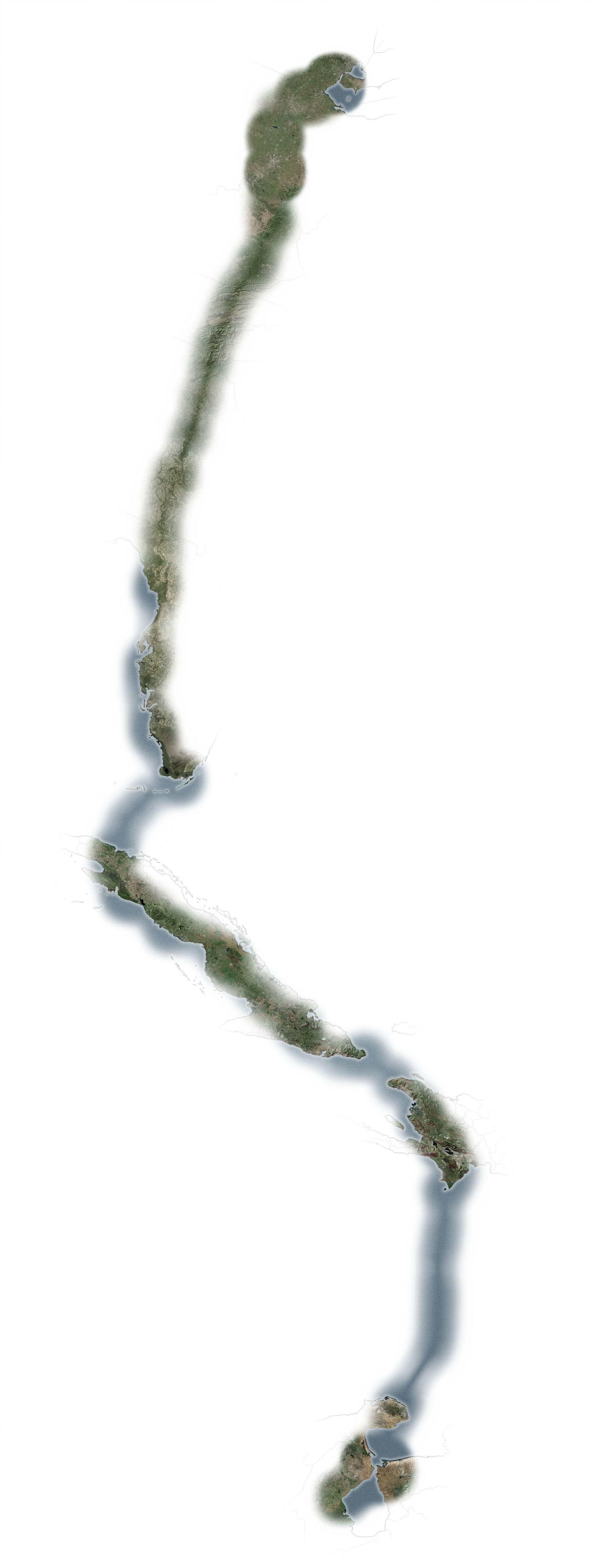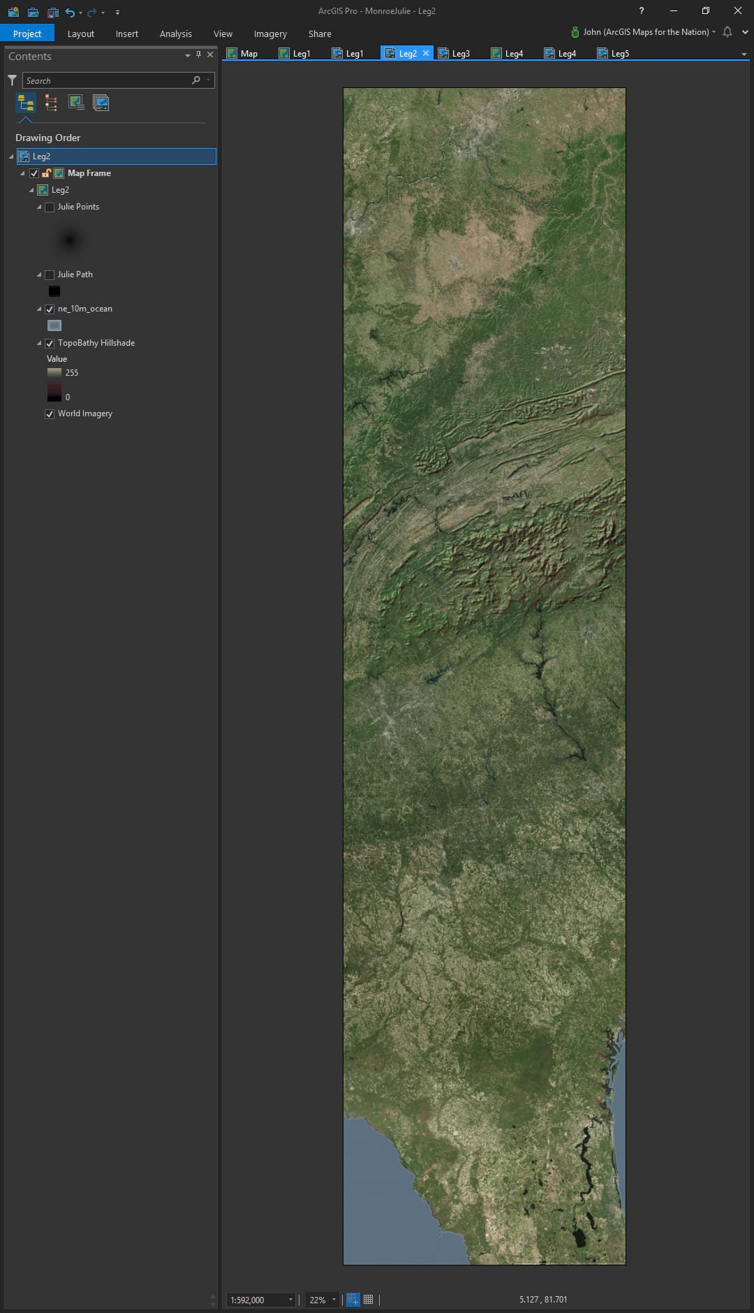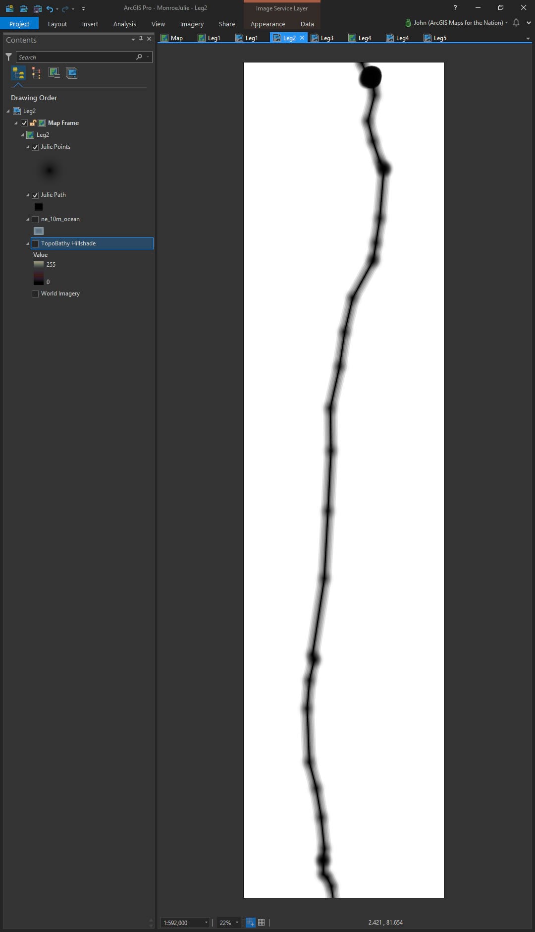In Pro, I created a tall layout and zoomed in on one leg of the journey. I turned on the imagery basemap and then added the topobathy hillshade service from the Living Atlas. I promptly re-styled the hillshade to get rid of the grays and make it Bumpified.