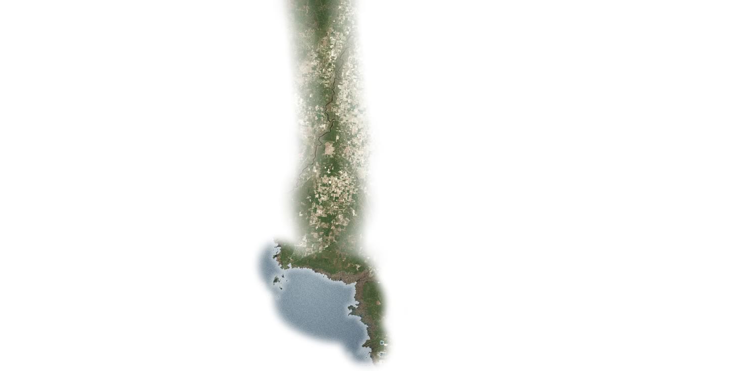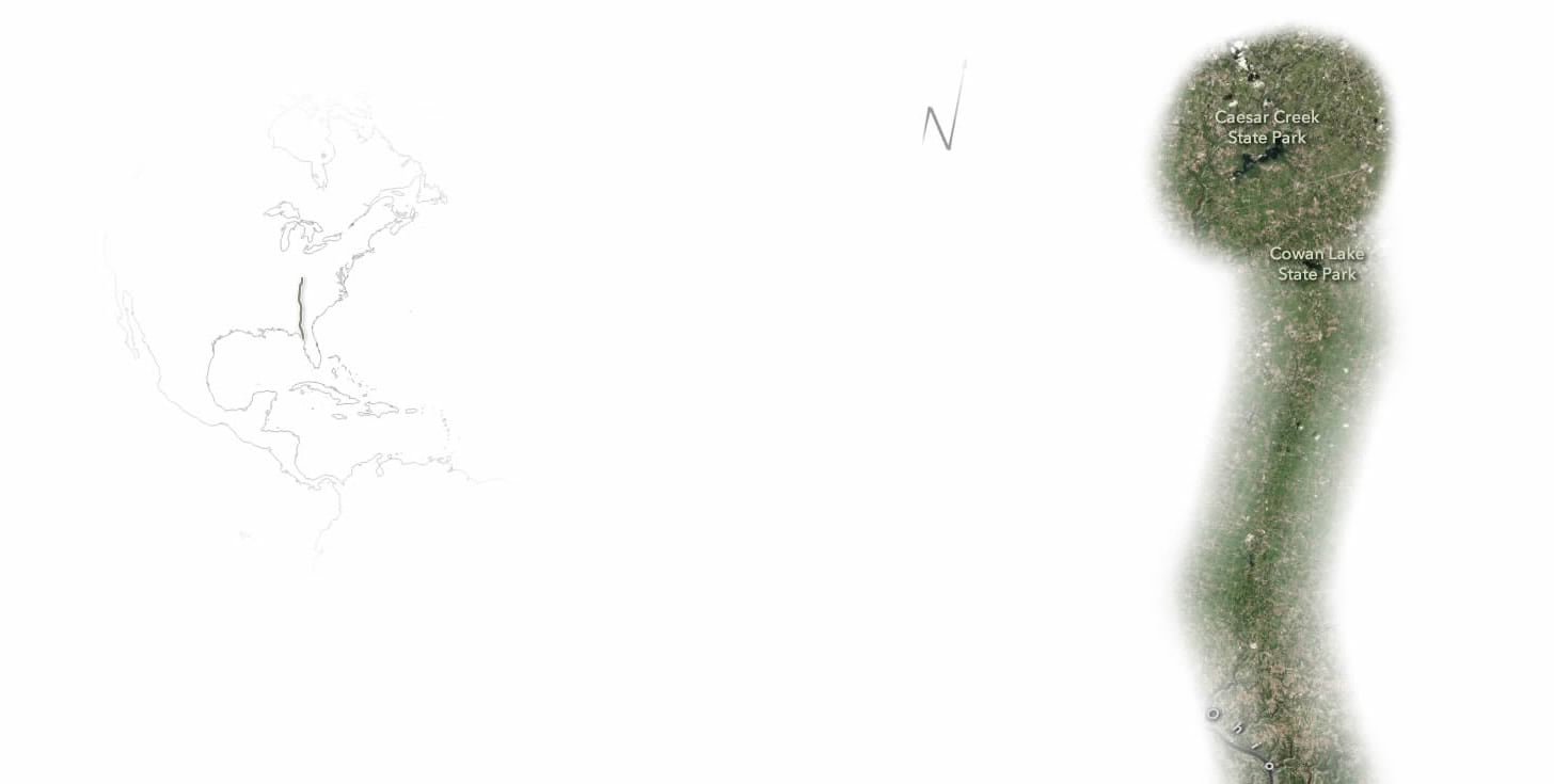 My goal for these maps was to create a bird’s eye view. The fuzzy map would be used to mask the imagery, like a reverse-heatmap. We would see only what Julie saw. I had experimented with this style some time back with this map about migration. More recently, Dylan Moriarty’s mental maps of childhood are beautiful examples of limited-view maps. For a story map like this, that plots the instinct-driven flight of a small creature who does not have the benefit of maps and satellite imagery, I felt a reverse heatmap like this, where Julie’s locations etched away at the landscape to reveal the land below, rather than occlude it, would help us empathize with her journey.