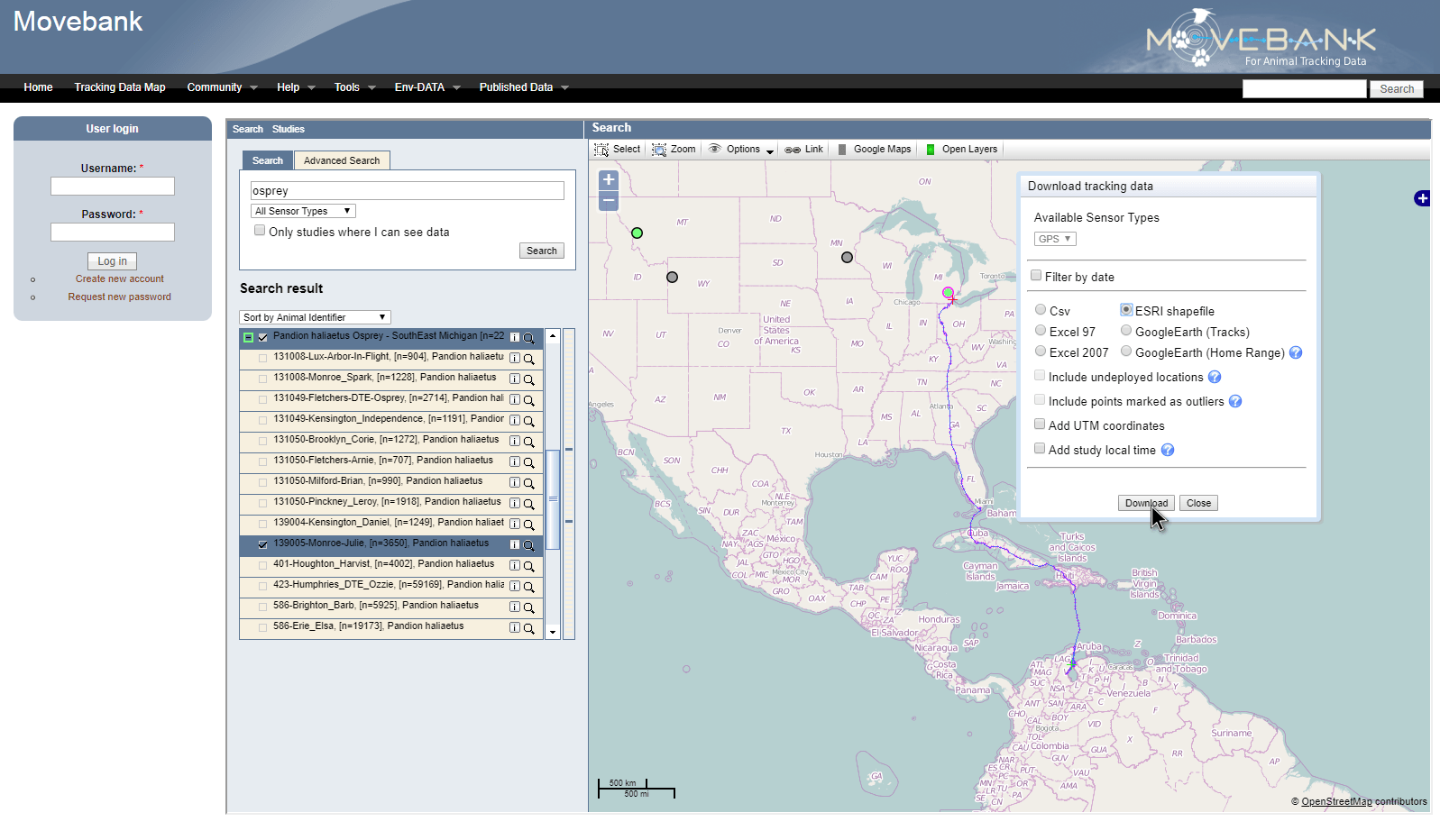 I downloaded Julie’s GPS tracking points from a free online database of animal tracking coordinates called Movebank. I searched for “osprey” and found Julie’s data (she hatched in Monroe county, MI, so that’s prefixed to her name).