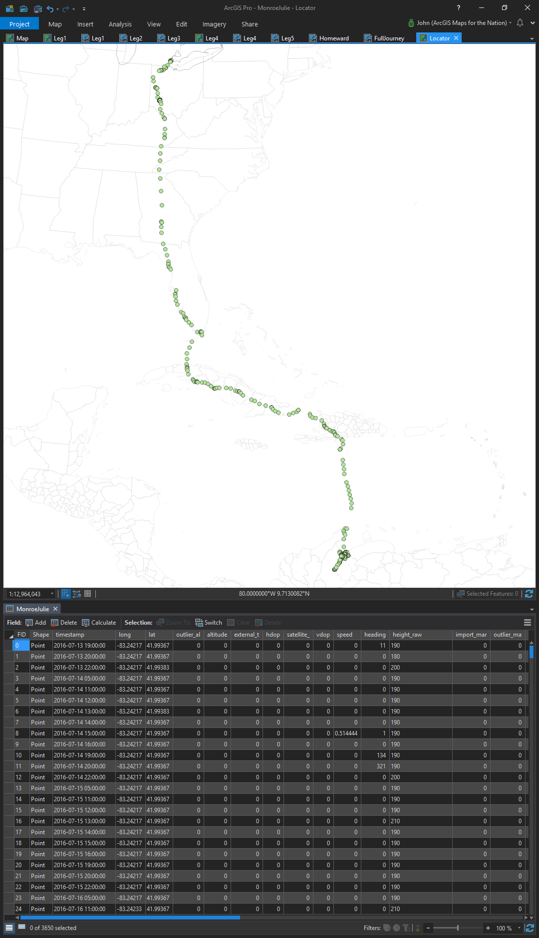Julie’s location data was 3,600 location points, and a line layer connecting them all chronologically. I wanted to get a sense for her pacing over the migration, to see which days she flew, where, and how far. My evil plan was to string together a set of really tall maps and narrate them in a Cascade story map. Fun, right? I opened up the DBF file in excel (did you know you could do that? It’s a fun little thing if you want to do some quick table-work. Just don’t overwrite!) to jot down some migration notes to myself as I poured over the location markers in ArcGIS Pro. I knew that Julie’s migration would be too long to show in a single map so I wanted to get a sense for how I could break up the migration into a series travel maps.