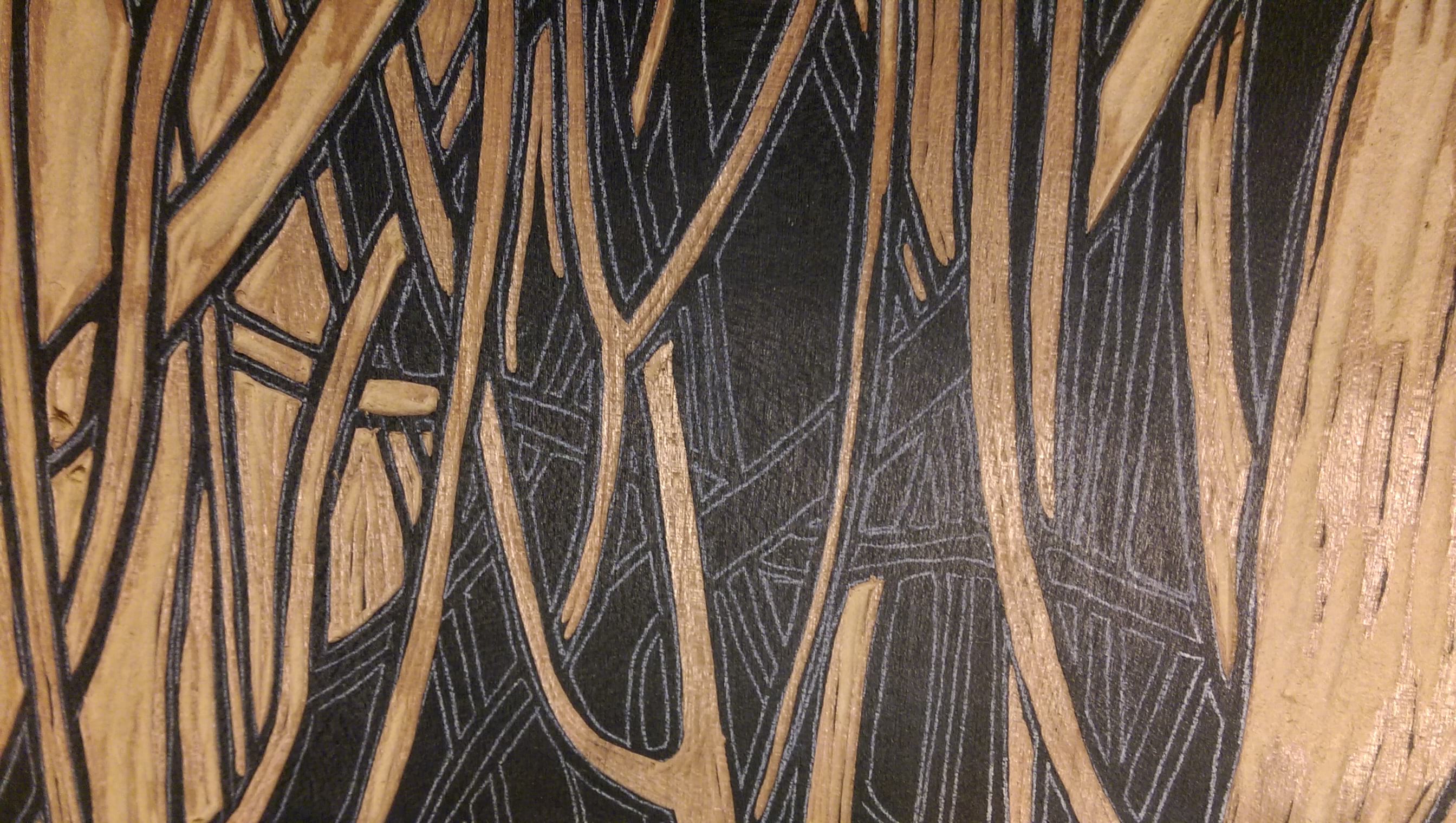The key thing to understand about woodcut is that you are carving the negative space. It’s the part of the wood you don’t carve that will form the black lines on paper– these are the raised parts that the ink sticks to.