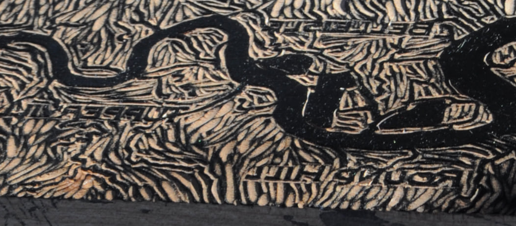 I actually recommend tracing the outline of every line and letter, instead of the lines themselves. This more work. But when it comes to carving, you want as little ambiguity as possible about what gets cut and what doesn’t. Below is an image of another woodcut in progress that shows the outlines of lines traced in white.