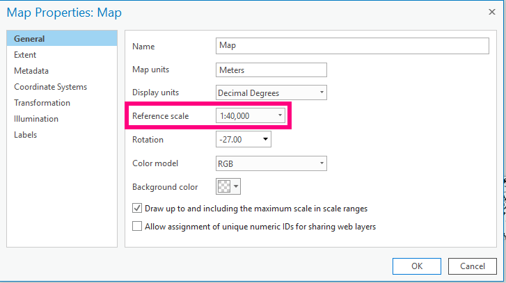 Once you’ve settled on a line width, add your (projected) map to the layout and activate it. Now you can pan and zoom and rotate until you’ve settled on an appropriate extent and scale. Open Map Properties to set the reference scale: