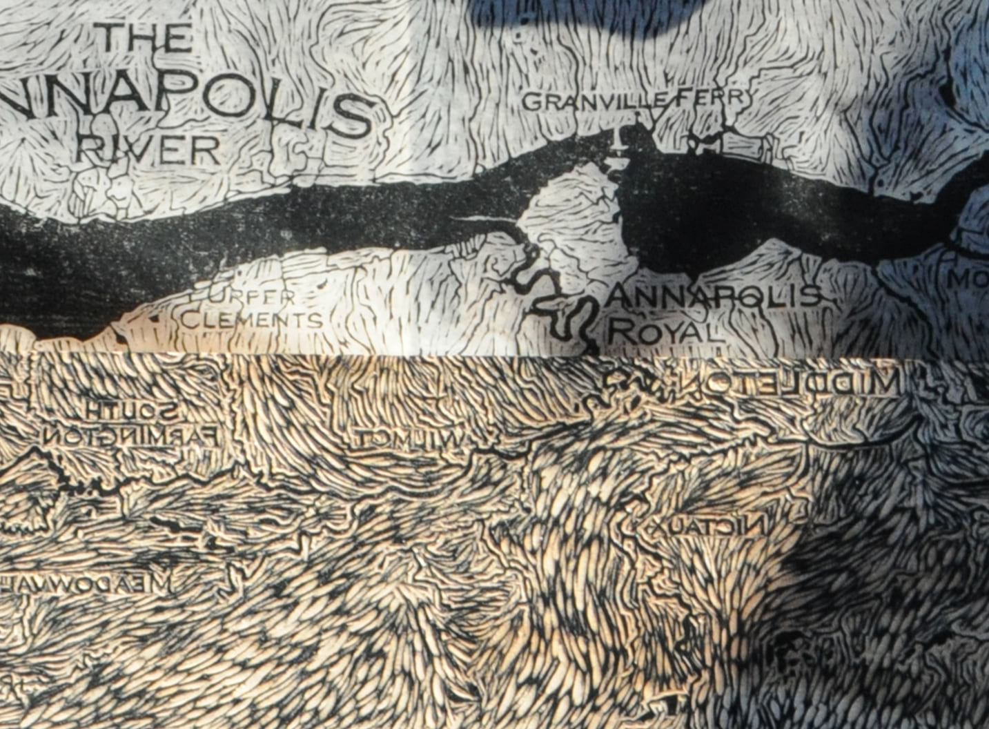 The Annapolis River map was carved into solid cherry, but I usually carve on cherry veneer plywood instead. Maple and birch are also good options. Conceptually, it can be hard to remember that the wood left behind is the black part and the wood carved away is the white part. This is easily solved by painting the surface of the wood black with india ink or watered down acrylic paint. You can buy white transfer paper at most art supply stores, which shows up well on the black wood. Tape the transfer paper and map to your wood so it doesn’t slide around while you’re working, and use a ballpoint pen to trace.