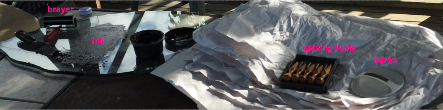 I print on thin Japanese papers. This allows me to print with a hand-held baren instead of a printing press. I print with oil based inks and a rubber brayer.