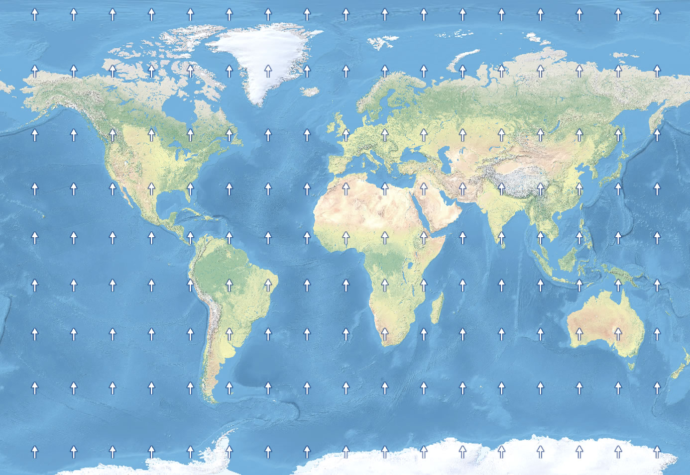 Ehhhh, probably not. Considering the global-perspective and north-is-presumed-up safeties, you could omit a north arrow on this map and it would be just as effective. But if you love a good north arrow or if your layout balance could use a nudge, then the good news is a north arrow would not be lying. Because Gall Stereographic is a cylindrical projection whose lines of longitude are parallel, a single north arrow tells the truth over the entire extent of this map. See?