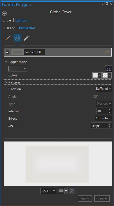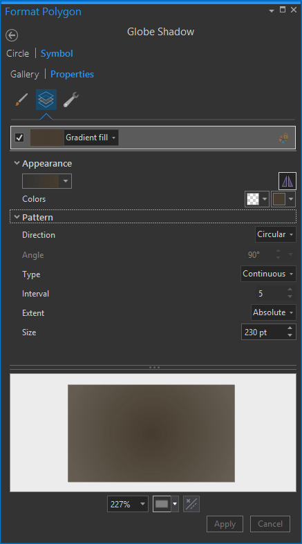 For this, I drew a circle slightly larger than the globe, dragged it beneath the globe in the Contents panel, and gave it this radial gradient fill: