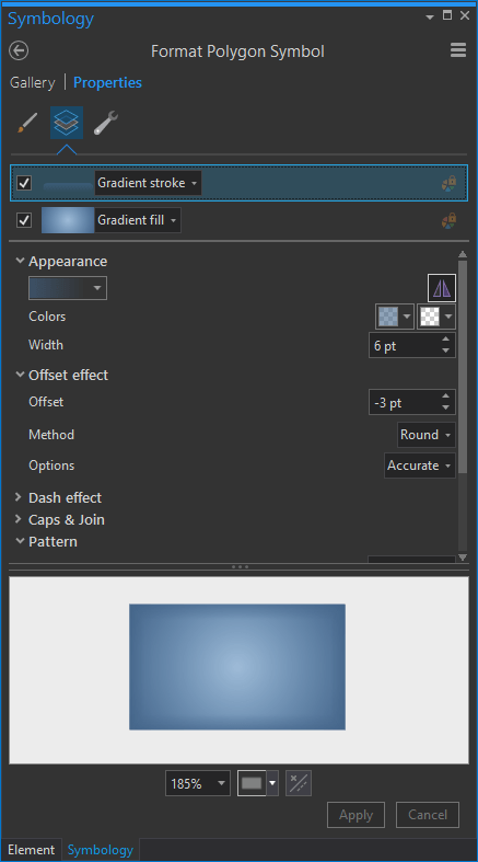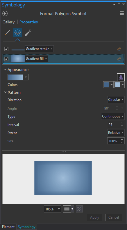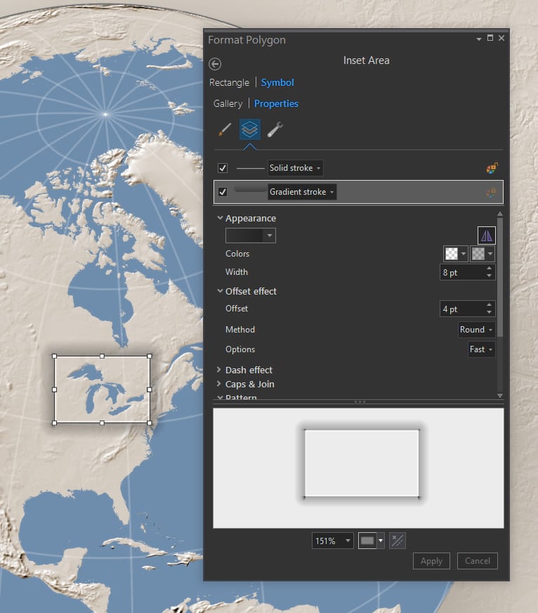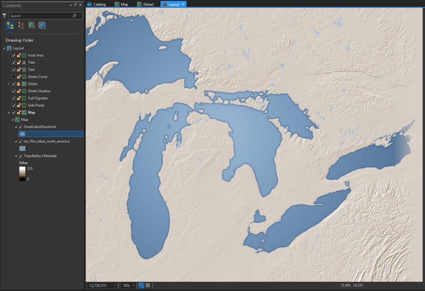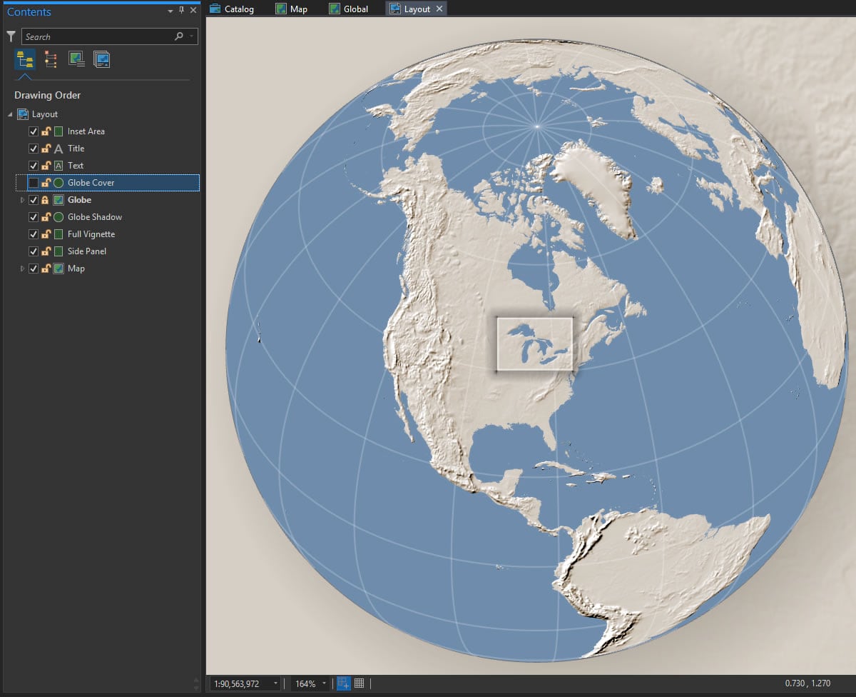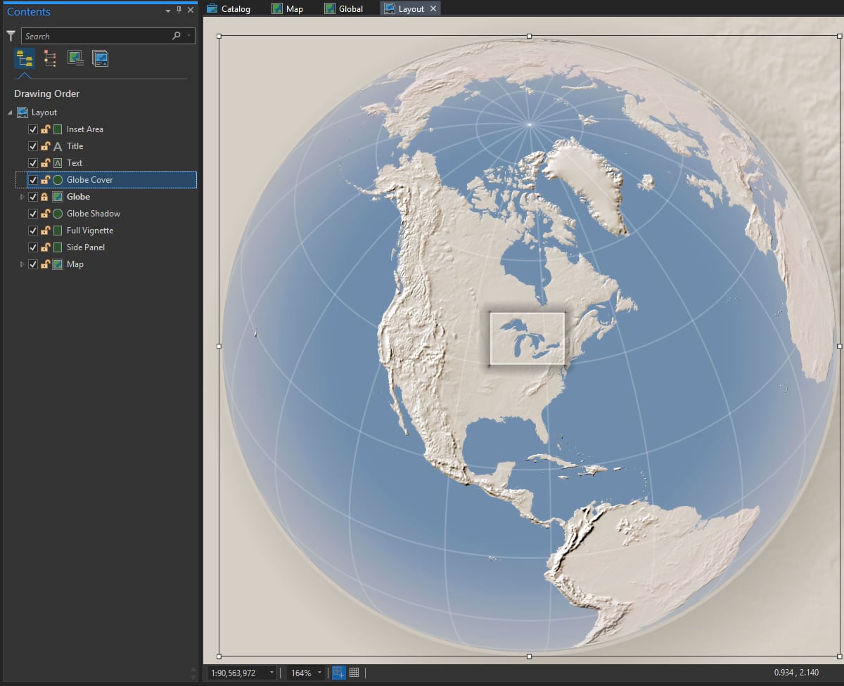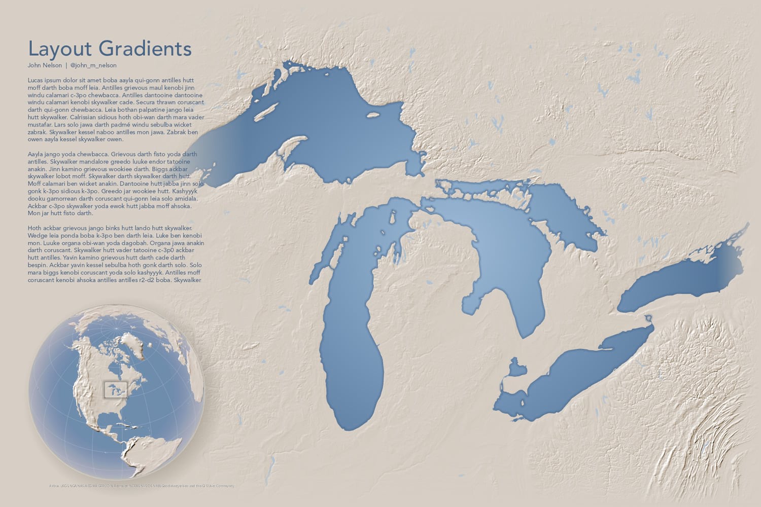 Gradients aren’t just for layout rectangles and circles. You can apply gradients (gingerly) to feature symbology, too. The glorious Great Lakes here have a radial gradient fill. It gives them a hint at being reflective water atop a sphere. More on that technique here.