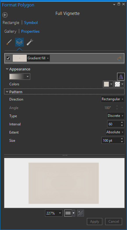This map uses a rectangular gradient around the perimeter of the map. From the “Insert” menu, choose “Rectangle” then just draw a rectangle. In its fill properties (right-click the row in the Contents and choose “Properties”), you can choose “Gradient Fill”. The thing that trips up most folks when creating a gradient that fades away fully is to set the same color for both colors of the gradient, setting the transparency of one to 100%. This gradient goes from fully opaque khaki to fully transparent khaki.