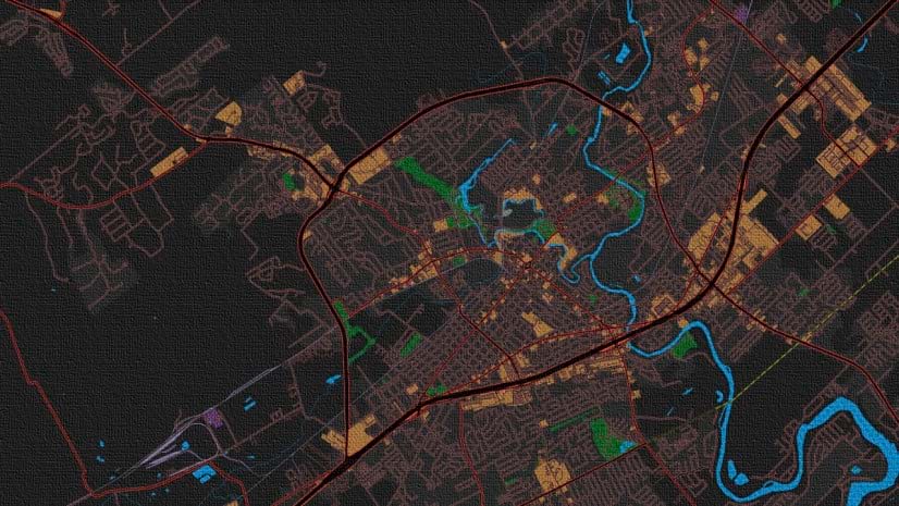 Here is an example that brings together the above three features to show ArcGIS Pro in dark theme, with user interface scaling set to 130% and the Enhanced Contrast Dark Map added to a map view.
