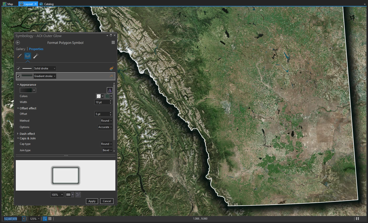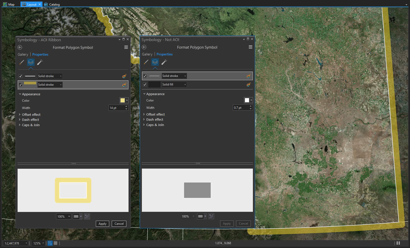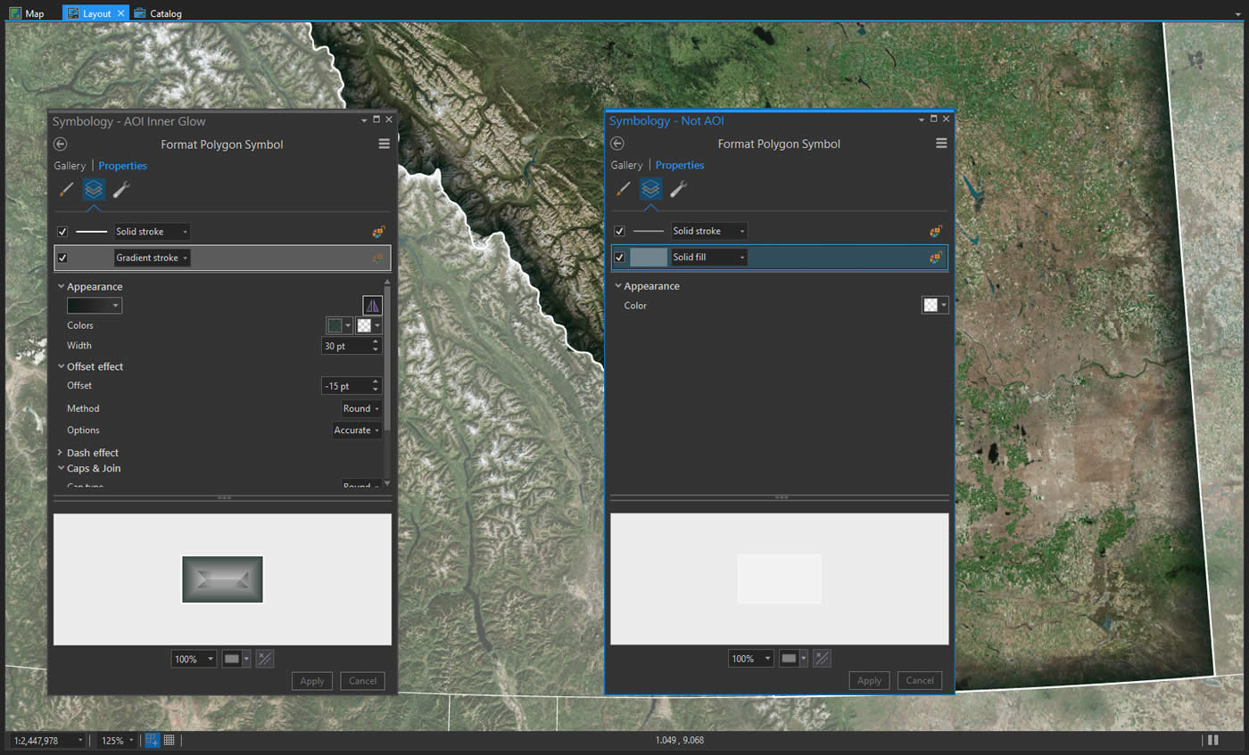 Because this semitransparent outline is so wide, I gave it an offset equal to half its thickness. This ensures that it renders outside of the boundary, drawing visual priority to, but not covering, the AOI. I also gave the AOI a thin white stroke to clearly define the border.