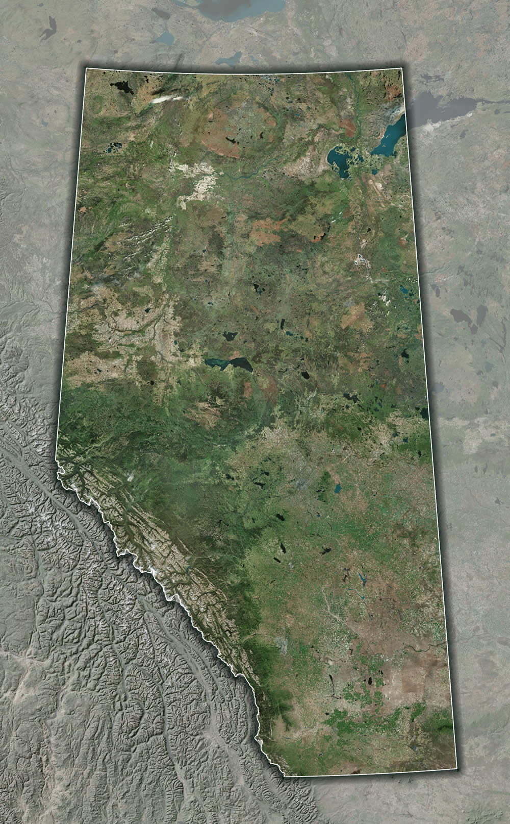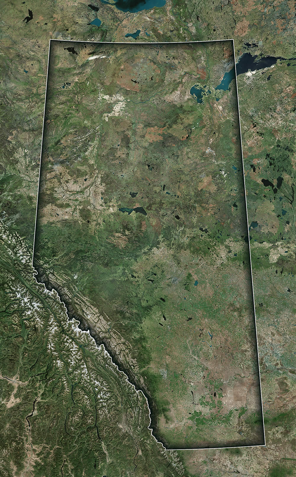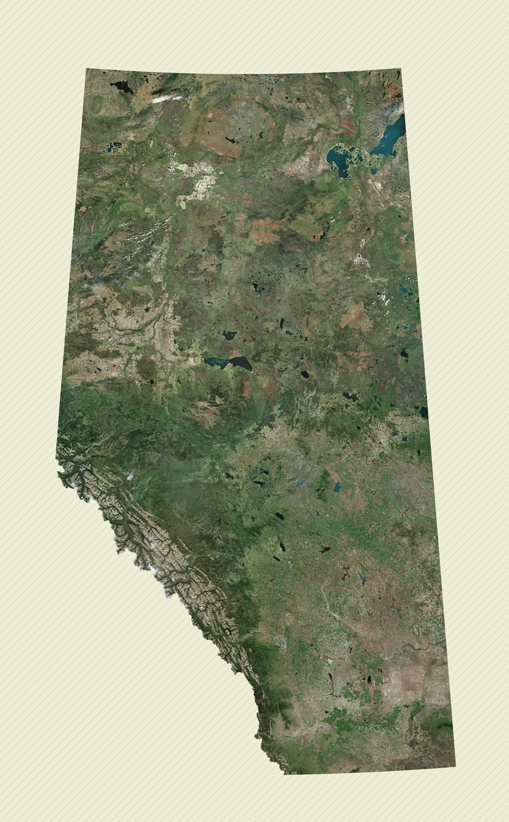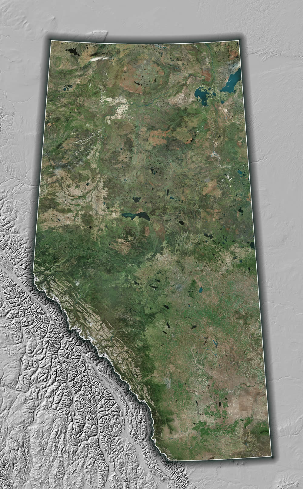 Let’s try something else entirely. In the map below we’ve got two layers: A hillshade layer and an imagery layer. I’ve masked the shape of Alberta out of the hillshade layer so that you can see through to the imagery beneath…