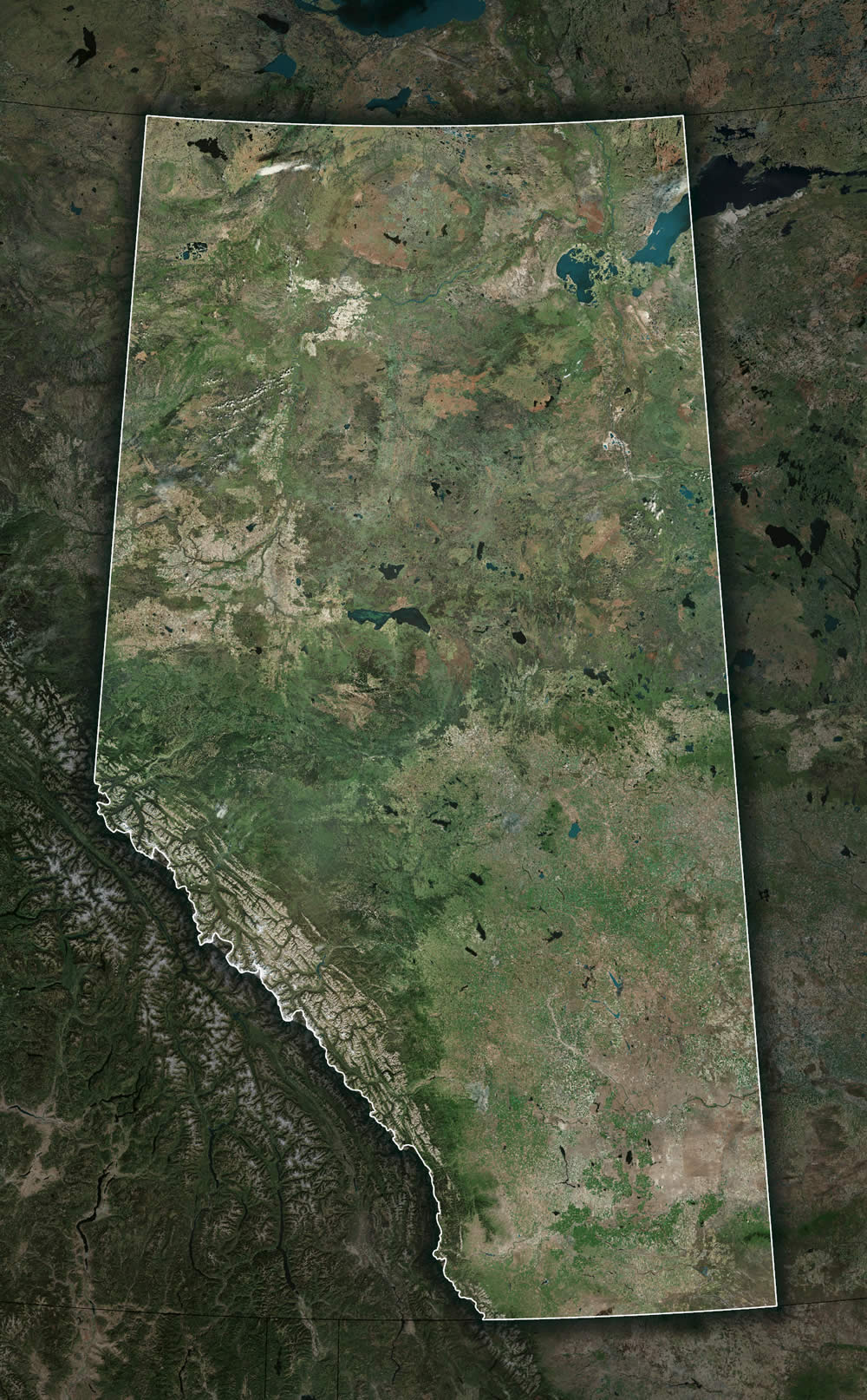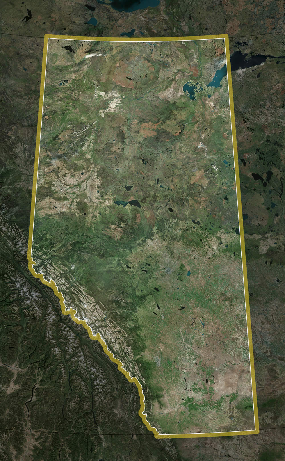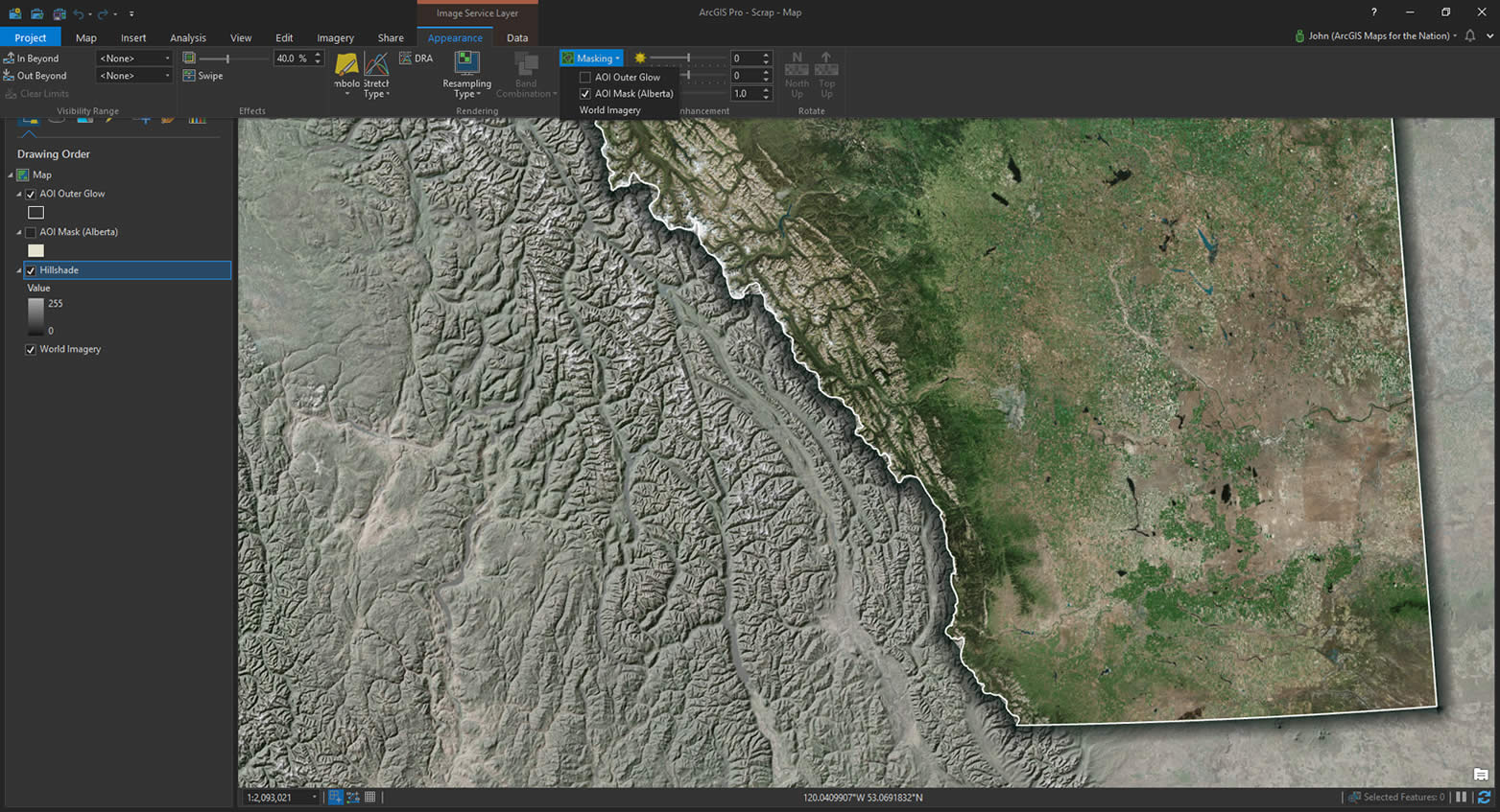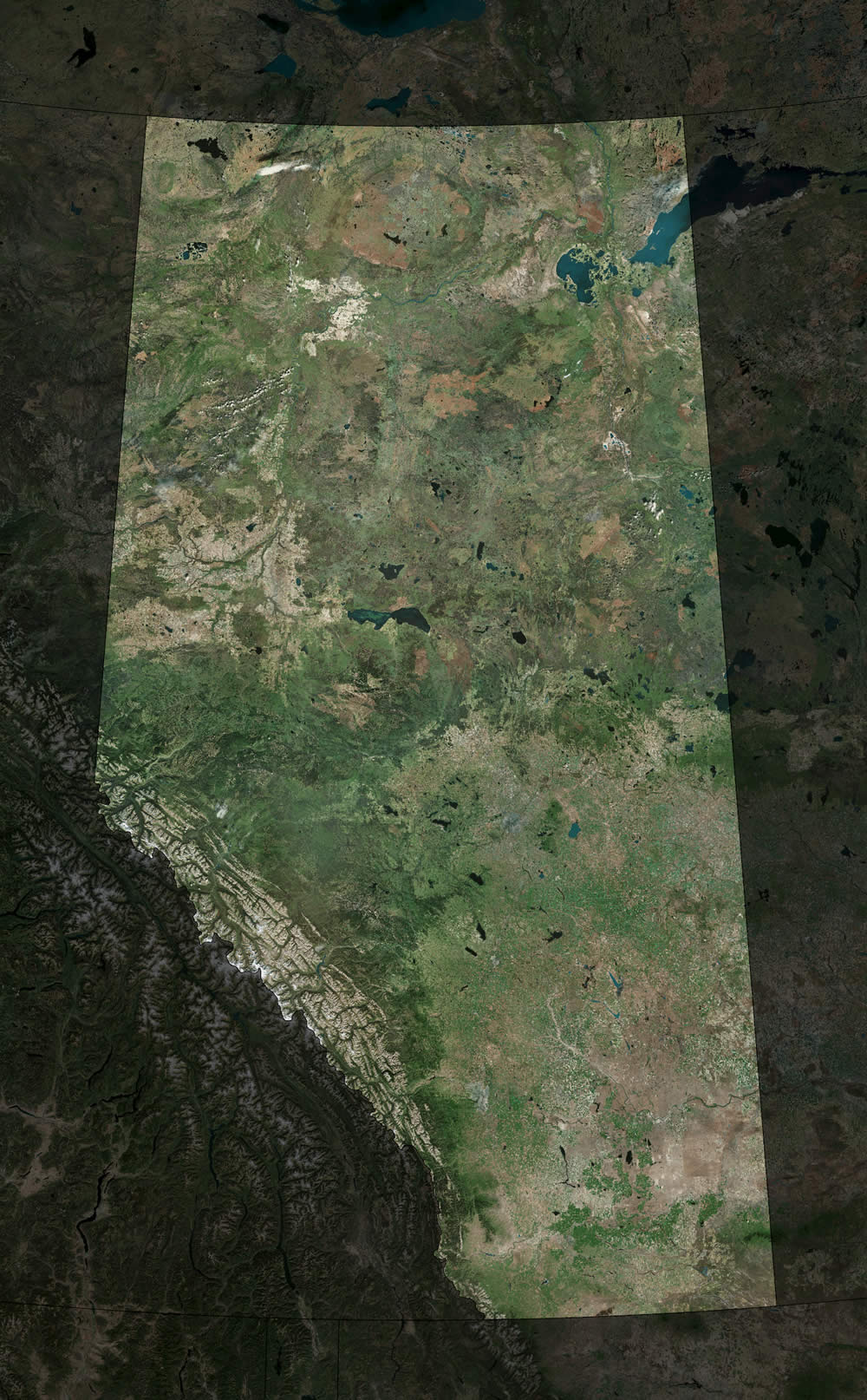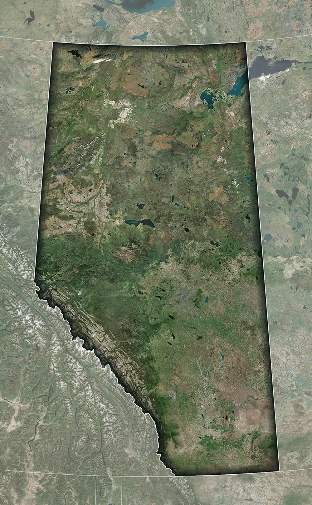 Let’s try something else entirely. In the map below we’ve got two layers: A hillshade layer and an imagery layer. I’ve masked the shape of Alberta out of the hillshade layer so that you can see through to the imagery beneath…
