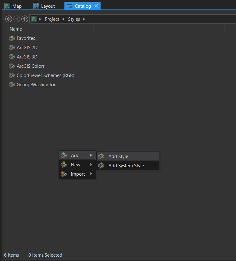 Here’s how you can add the George Washington style to your Pro project. Save this style file somewhere on your computer. Then, in Pro, open up the Catalog view, and expand the Style category. Right-click, and choose “Add.” Then just browse to where you saved George Washington. Pow! You’ll be whipping up maps that look like they were scribed by the right hand (I surmise, based on the way his trees lean) of George, himself.