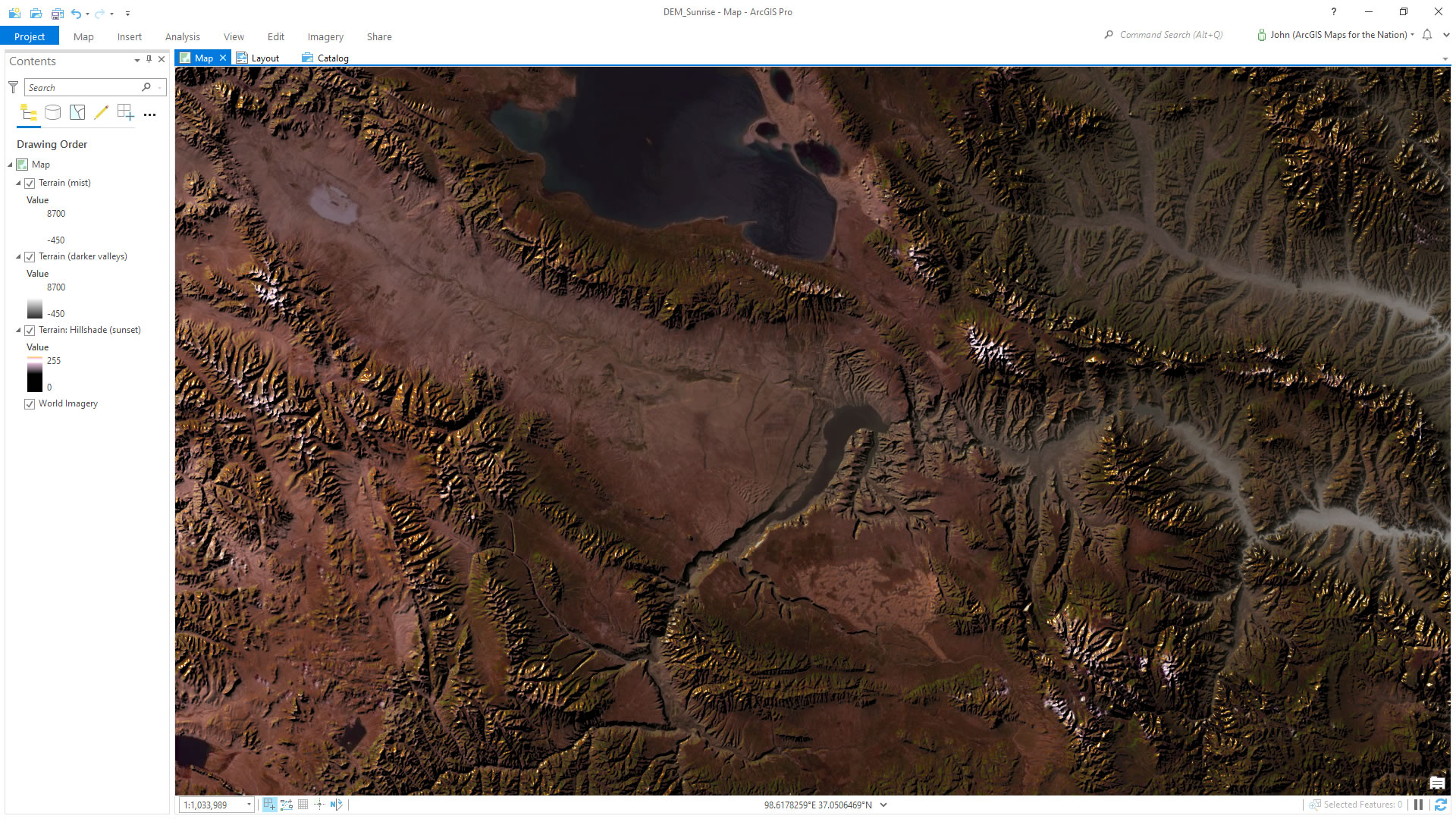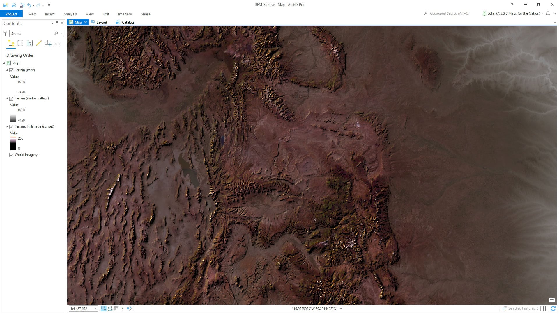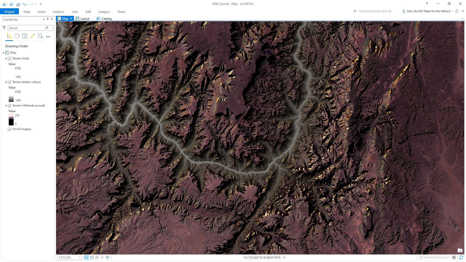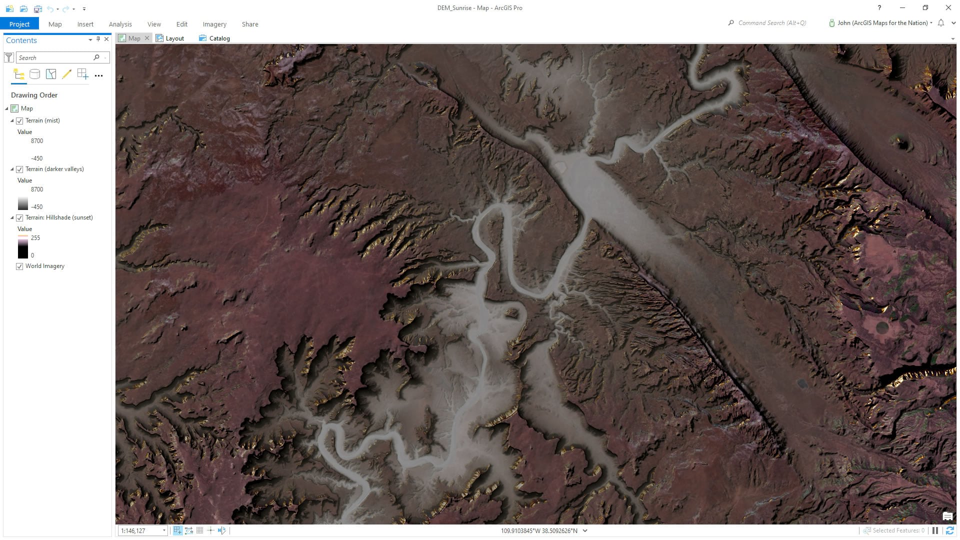 The Pro project package consists of a World Imagery basemap, and three instances of the peerless Rajinder Nagi‘s constantly-improving, impossibly beautiful, unreasonably handy terrain layers from Living Atlas: a terrain hillshade layer for lighting, a terrain elevation layer for valley shadows, and another terrain elevation layer for mist.