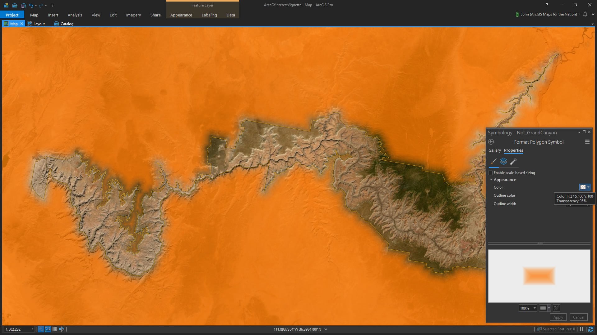If you need an overlay color other than black or white, then more power to you! Do this by opening up the symbology panel’s Properties > Symbol tab and make it whatever color/transparency you like.
