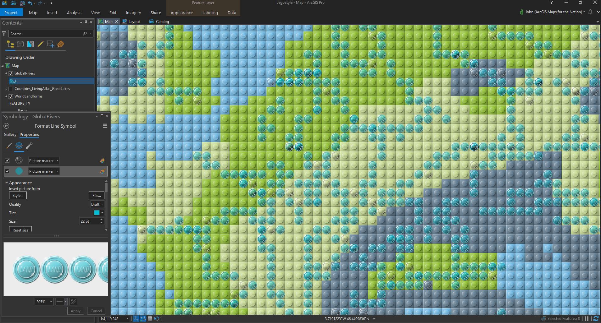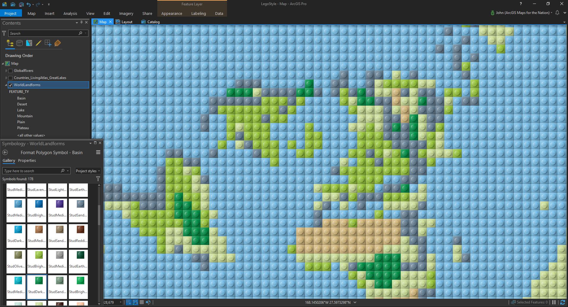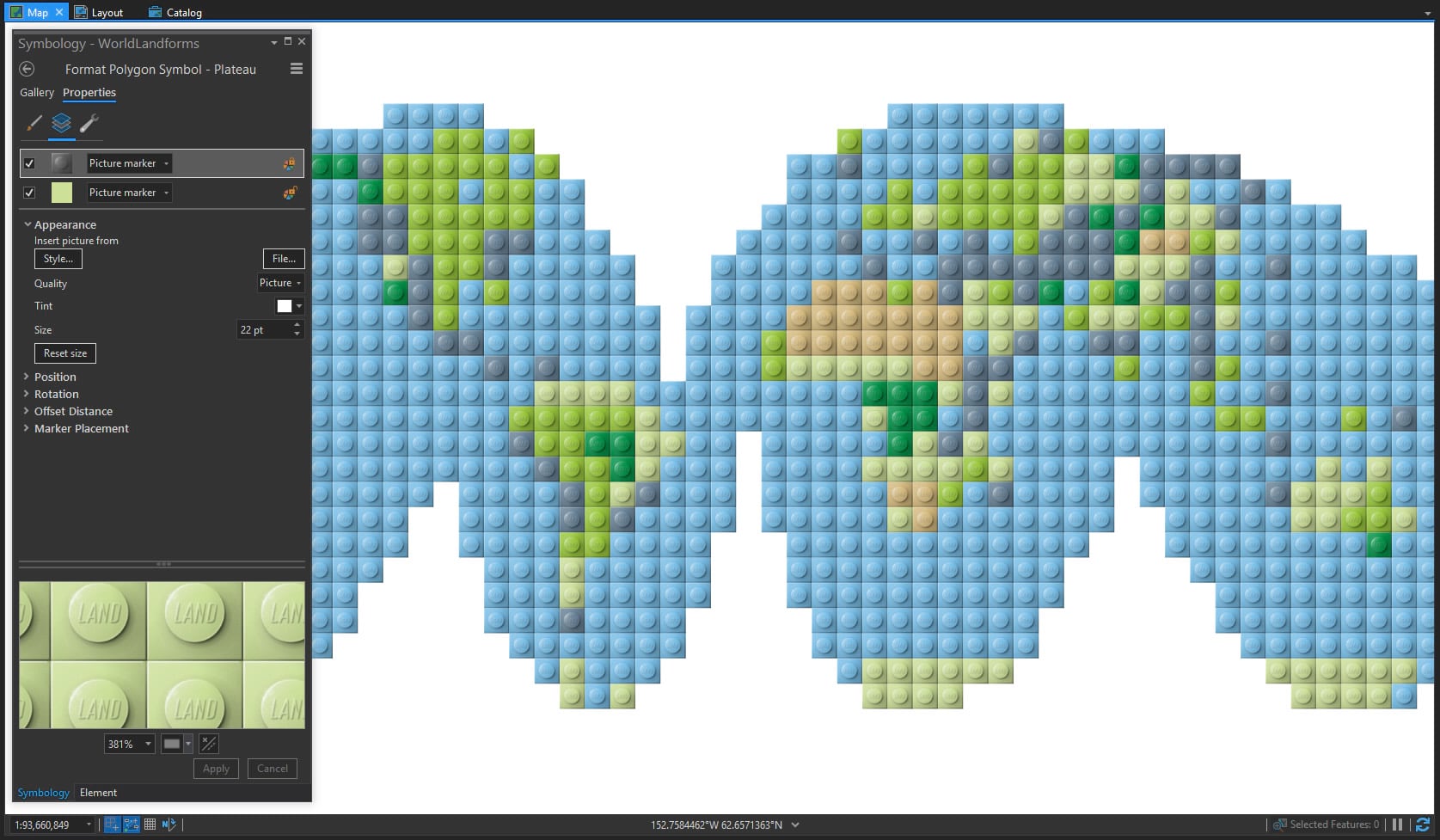 But I made this Lego-looking map via a manual process of tessellation, etc. I was not clever enough to make a dynamic style that would just Lego-up my maps for me. But then I stumbled into using marker symbols to make Larry King Live sorts of dotted background map sorts of things that graphic designers like. And the gears started turning.