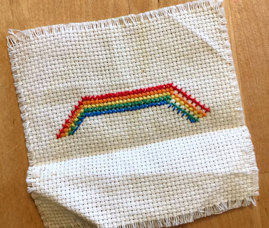 I was a pretty shy kid, and rarely participated in my kindergarten class’ show and tell sessions, but I was so proud of this rainbow and mustered the nerve to bring it in. I remember it pretty clearly. When it was my turn I fished it from my pocket and told the class, probably mostly inaudibly, about how cross-stitch is like coloring but you draw with a needle and string by making little “x”es. When it was time for questions, a kid raised his hand and I pointed to him. He told the class, “only girls sew.” Some of the kids chuckled. I returned to my seat and the rainbow went right back into the pocket.