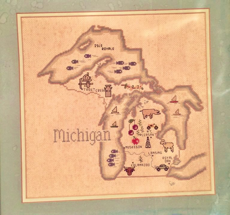 Maybe mom was a little disappointed I never wanted to do any more. I don’t know. She was a textile artist and spun thread and wove it. When we were kids and that equipment slowly moved into the garage she shifted over to cross-stitch. Here’s a map of our home state of Michigan she made that hung on our walls growing up, and still hangs in my dad’s house. It’s one of those objects that someone we miss has invested a little spark of themselves into. And I appreciate it for that.