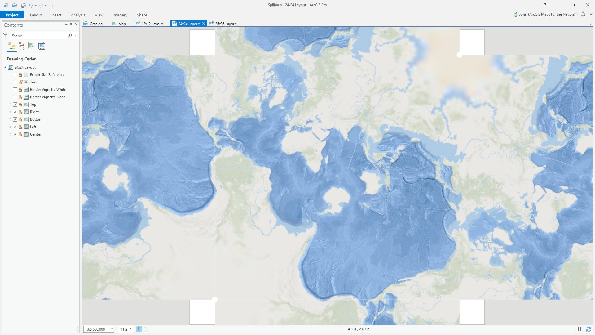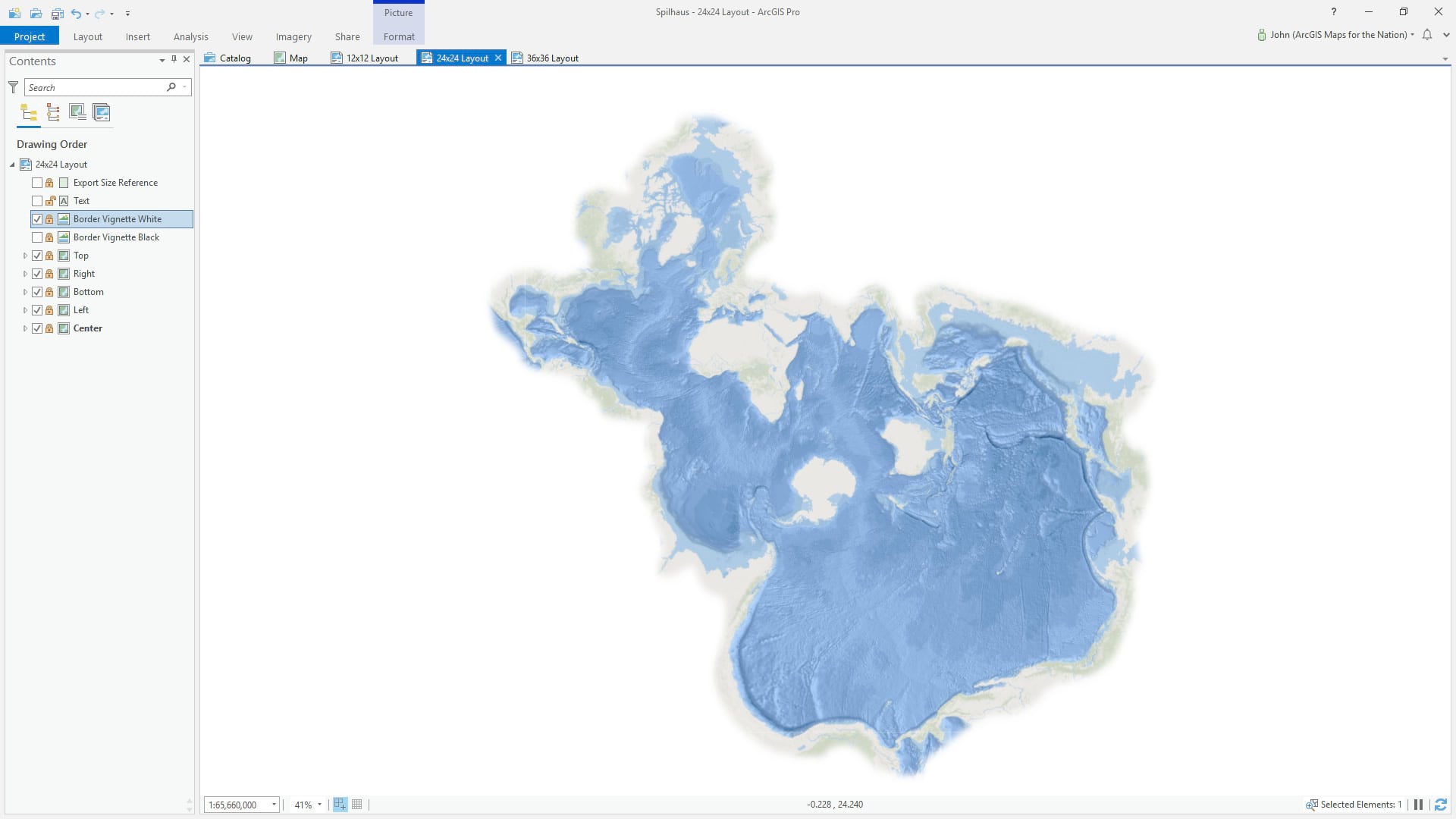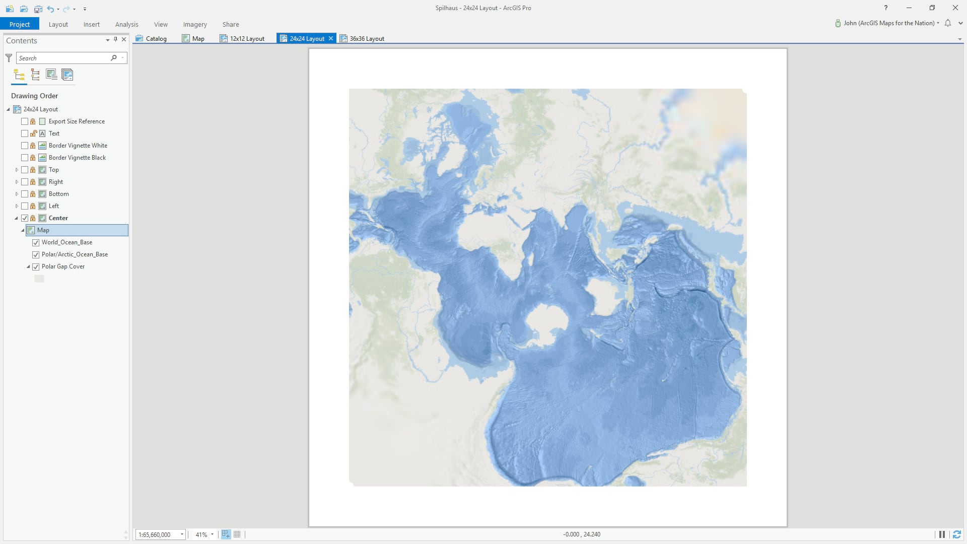 We made layouts that create an uninterrupted view of the oceans. Because repeating geography is a bit of a mathematical black hole in GIS, the Spilhaus map clips a bit of water at the perimeter in the Gulf of Mexico and the Bering Straits.