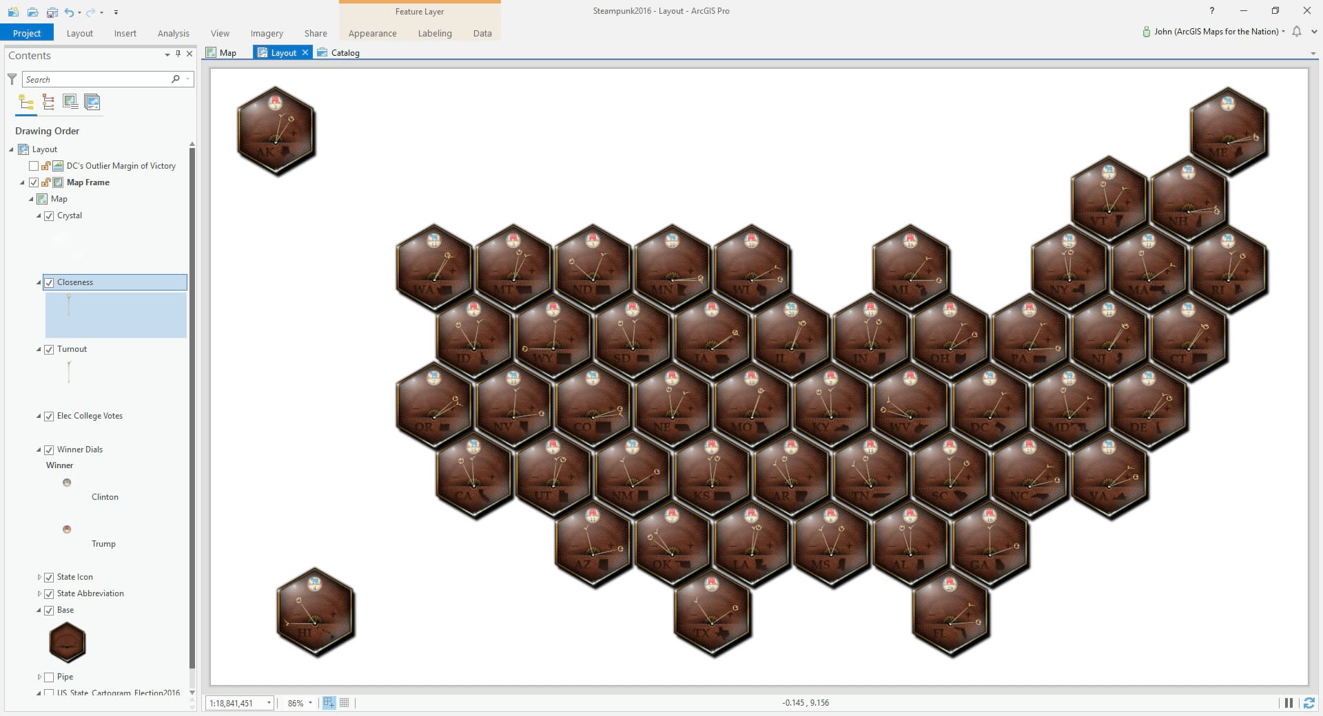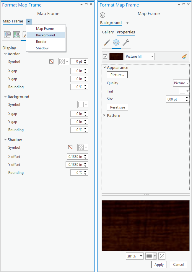 So we have all these plausibly-realistic steampunk watch-face gauges showing us election data in an analog fashion but they are floating in white space. Let’s give these little mechanistic doodads a nice deep walnut base. You can play with the background and outline properties of a Layout’s Map Frame (double-click the map frame). I have a nice stock image of walnut (or maybe rich mahogany?) that I’ve made (included in the pack of images, and even the style, if you are following along).