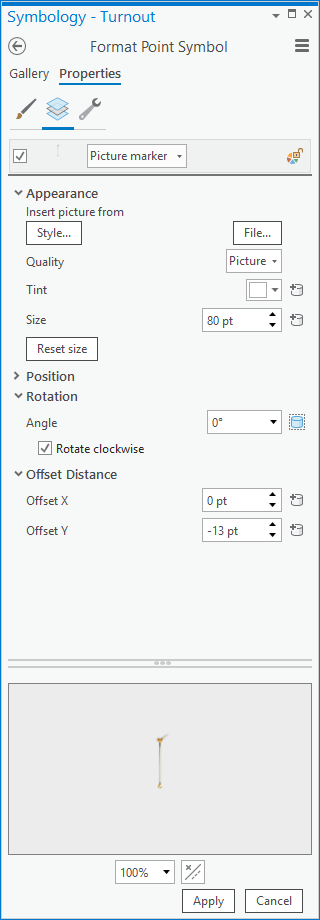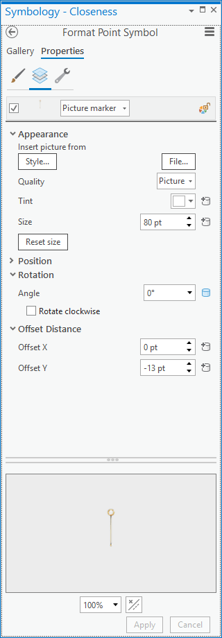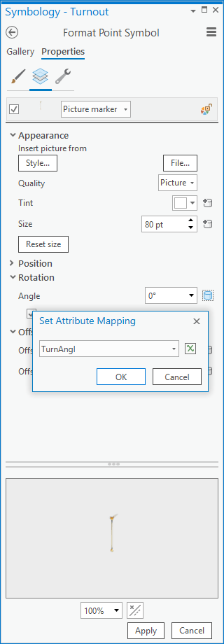 Here is the symbology panel for a copy of the layer where I set the symbol to be the check-mark looking needle (you know, like a vote), which will represent turnout (the proportion of voting-age citizens who actually voted). I sized the picture symbol so it fit well over the background and nudged it down a bit so its hinge appeared in the right spot.