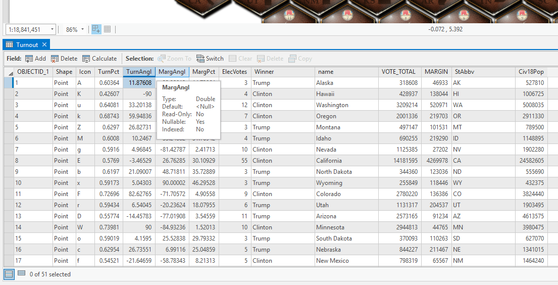I created a new field for both turnout angle and closeness angle, and used the Calculate Field thingy, and this formula, to populate them. In both cases “NewMin” was -90 (needle points fully to the left for the smallest value, like a speedometer) and “NewMax” was 90 (needle is floored to the right). The “OldMin” and “OldMax” values were just the lowest and highest state values for turnout or closeness (except for DC’s closeness value, a massive outlier—more on that later). And it worked like a charm!