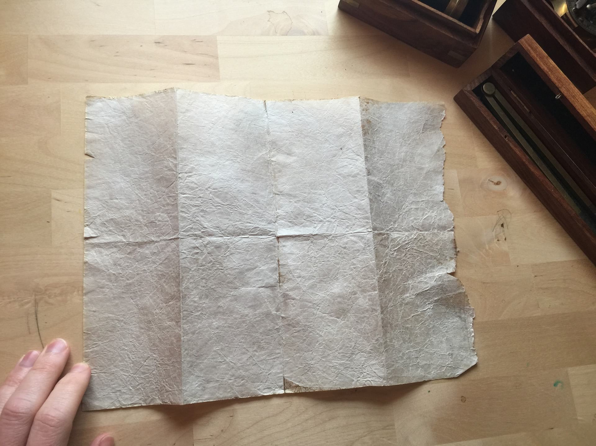 I thought I’d like to create a similar sort of folded paper resource for cartographers so I looked around on the internet for a free tattered paper texture. When I realized I could make my very own in like three minutes I put down the mouse and ripped out a sheet of old drawing paper, tattered it up, rubbed a bit of olive oil into it, and folded it into map panels and scratched up the creases.