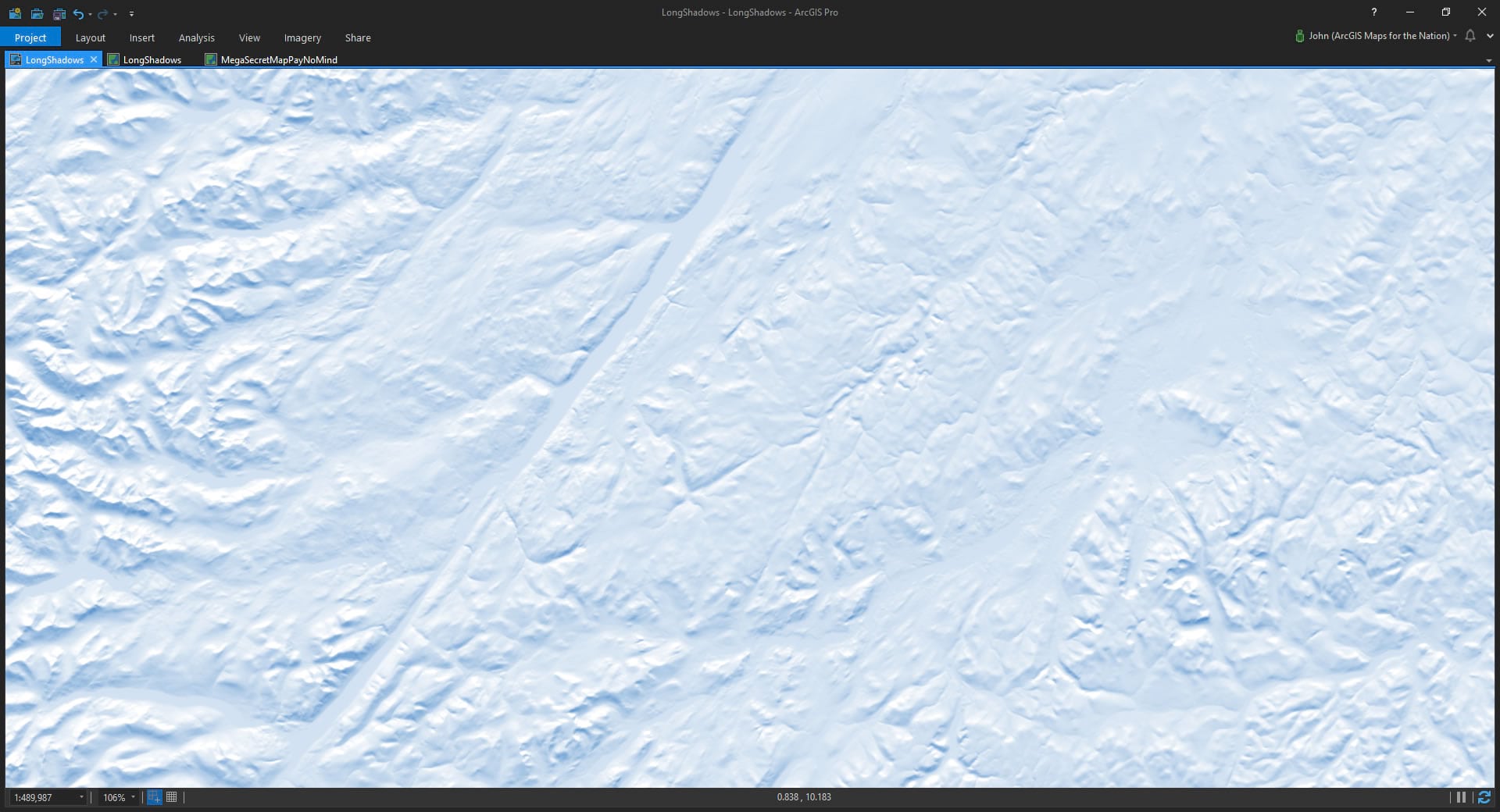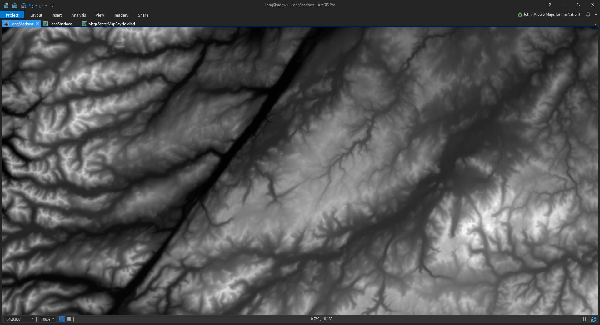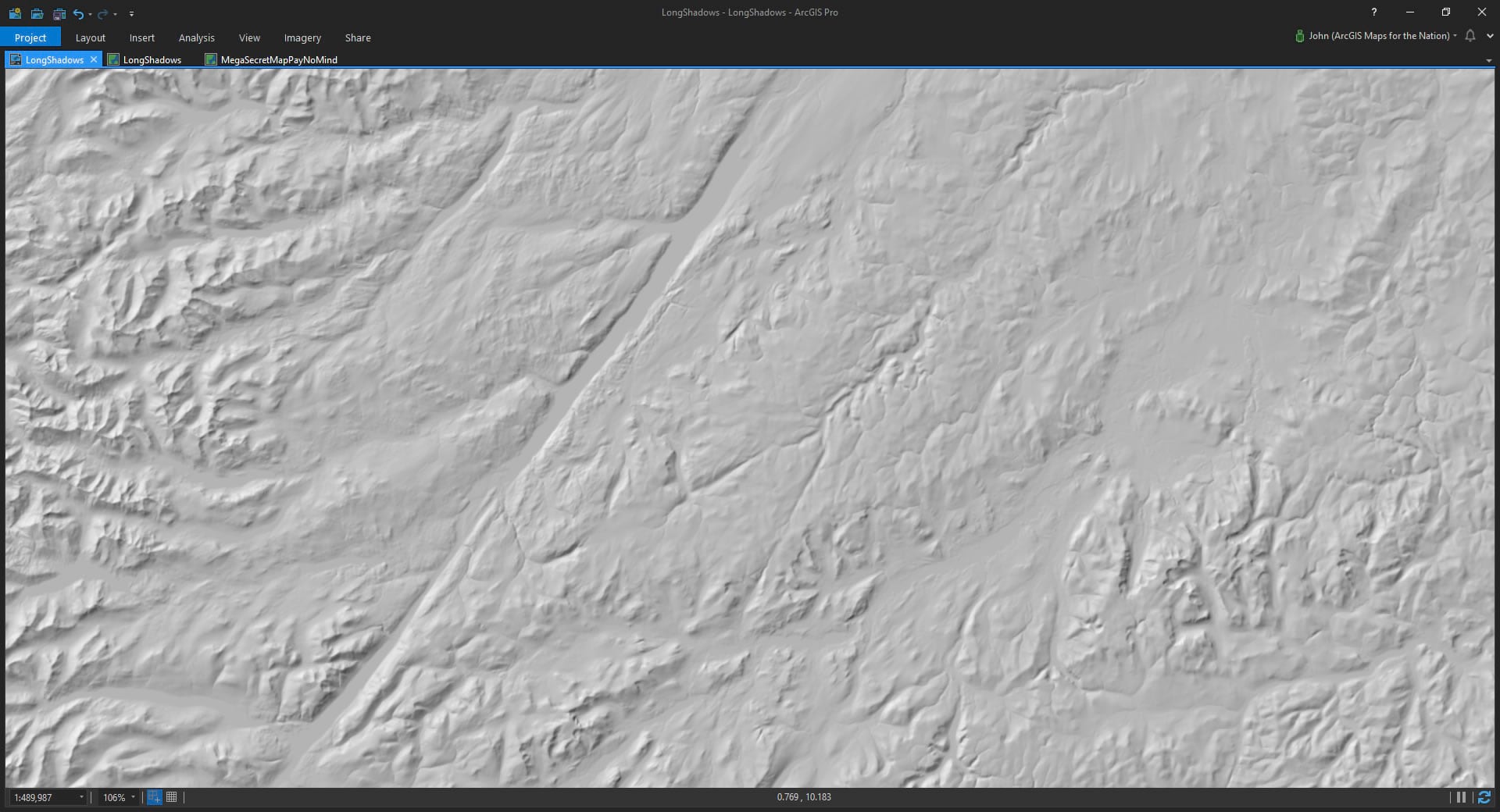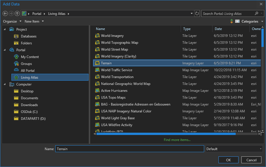 Ready? Ok, in ArcGIS Pro, I’ve added the “terrain” image service from the Living Atlas. It’s a digital elevation model (DEM) that scales with you as you zoom and navigate. And the Living Atlas team is always working to add more and better data over time, which rules. It’s a great resource and I use it all the time. You can add Living Atlas content right from the “Add Data” browser in Pro.