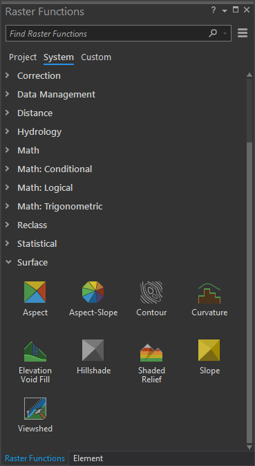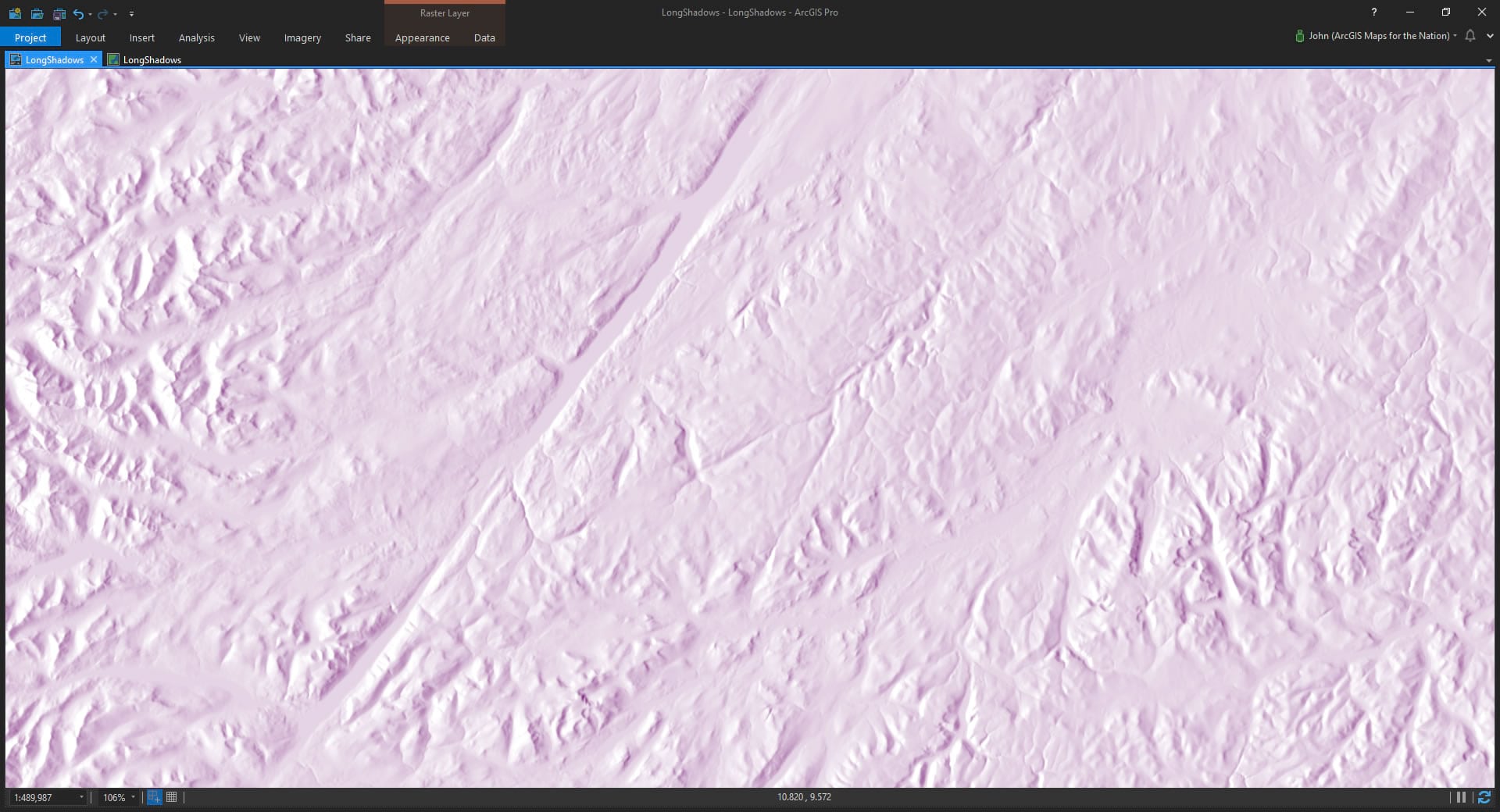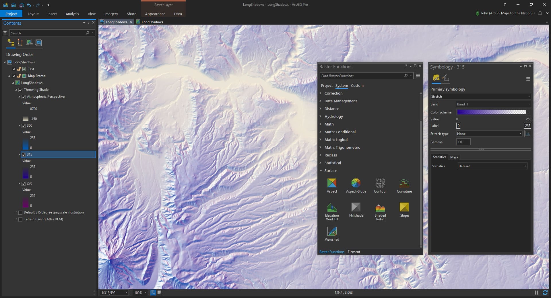Next I’ll run the traditional hillshade tool from the Raster Functions. It’s a shockingly fast renderer that calculates the virtual hillshade on the DEM image service and shows it to you in Pro (without having to save a new layer).