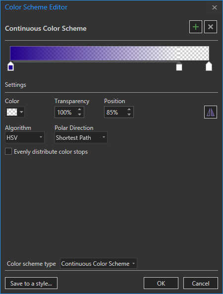 That’s cool and all (grayscale is actually a great default), but in real life shadows just aren’t perfectly black and light isn’t perfectly white. And light doesn’t come from an impossibly precise single direction. Defaults are not the boss of us. In this case I’ll go with a cool royal blue of #23008C (shorter wavelengths are more prone to scatter) that transitions into full transparency at a position of 85% (since I’ll be stacking up a couple more hillshade layers so I want to give the “sunlit” areas a bit of breathing room).