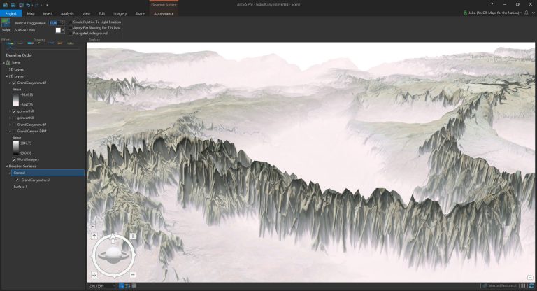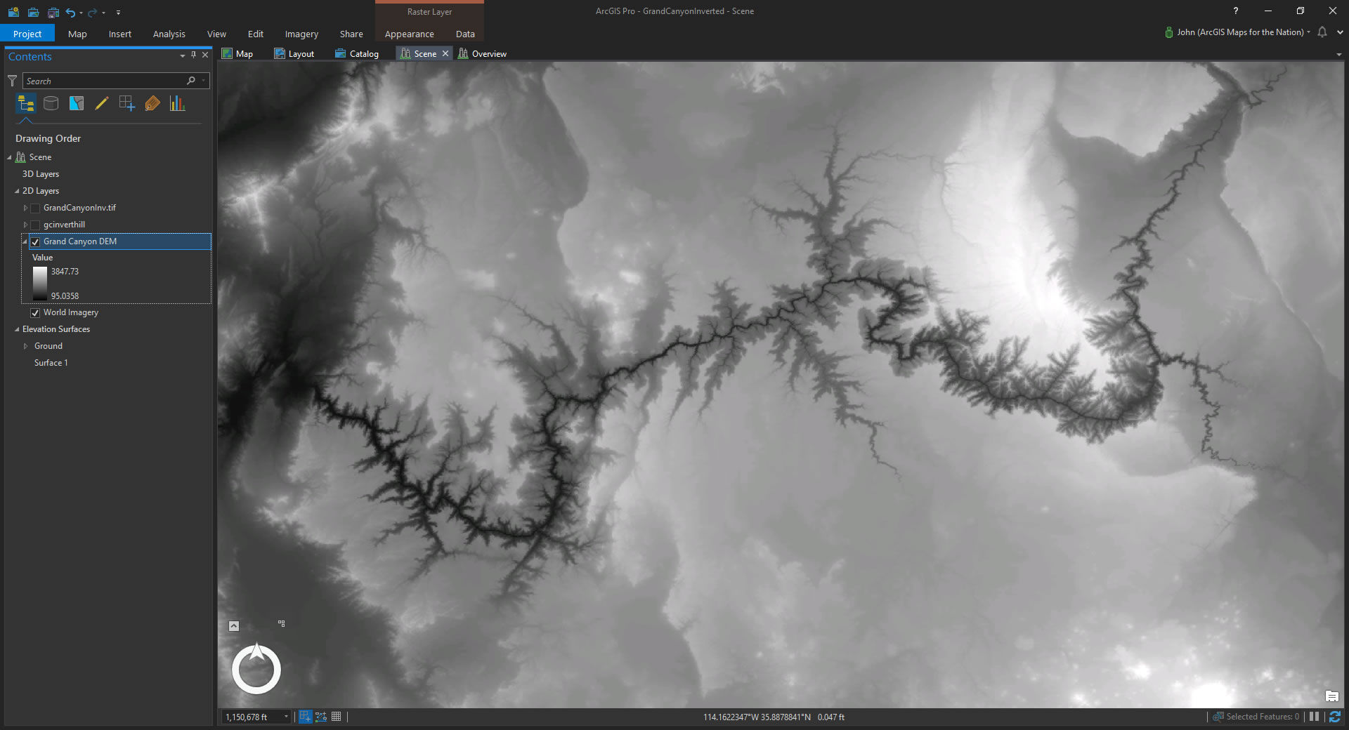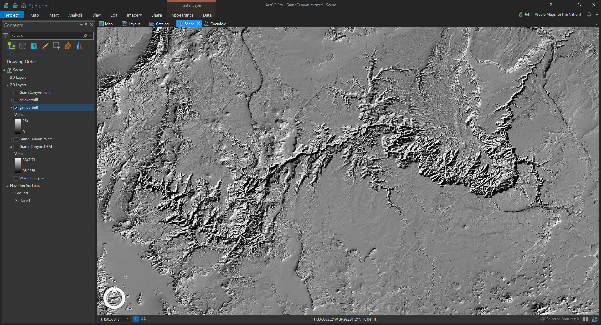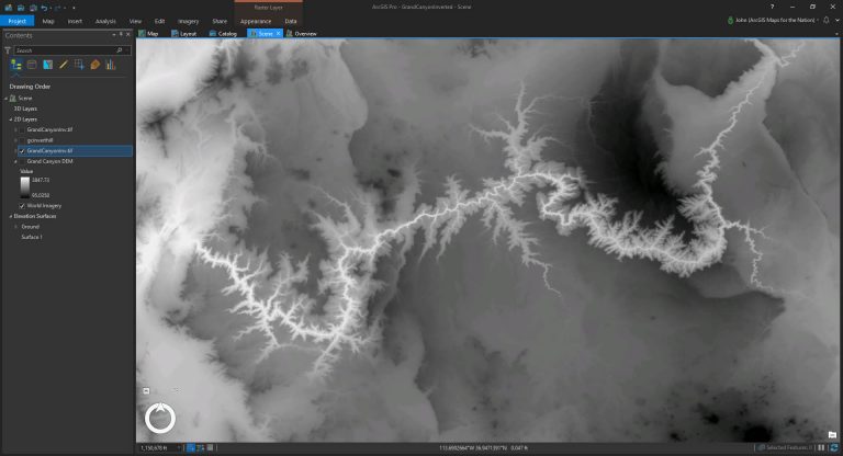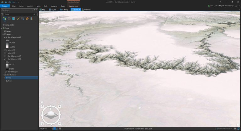 Let’s put on our bizarre-o caps and fire up ArcGIS Pro. Here is a Local Scene with a DEM image of the Grand Canyon area.