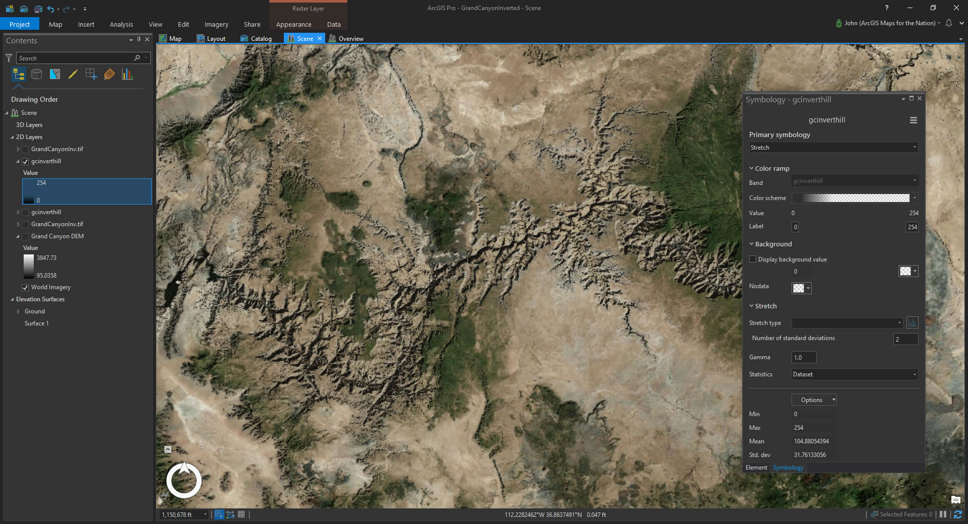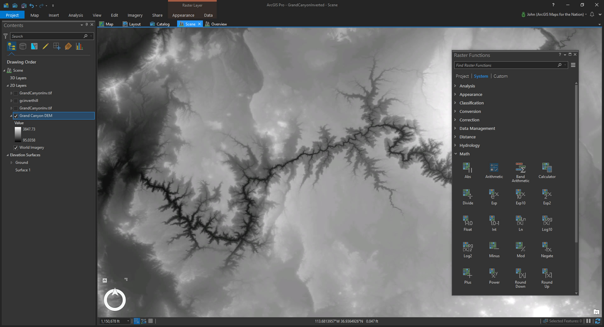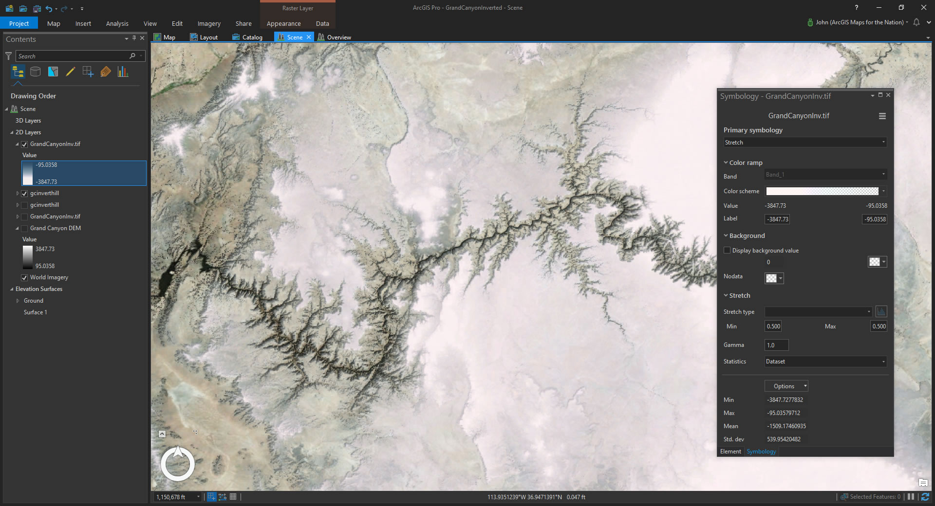 Let’s put on our bizarre-o caps and fire up ArcGIS Pro. Here is a Local Scene with a DEM image of the Grand Canyon area.