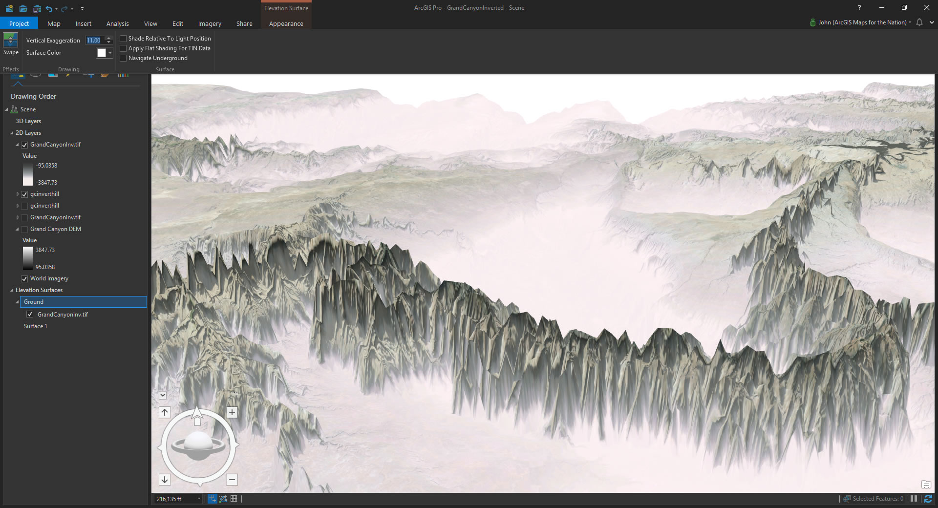 Step 4. Swapping out the elevation data for your inverted one. So now you have a 2D mountain where there was once a canyon. But it doesn’t really look too mountainous. We are in a 3D local scene, though, so let’s give this guy a tile and see how the elevation looks…