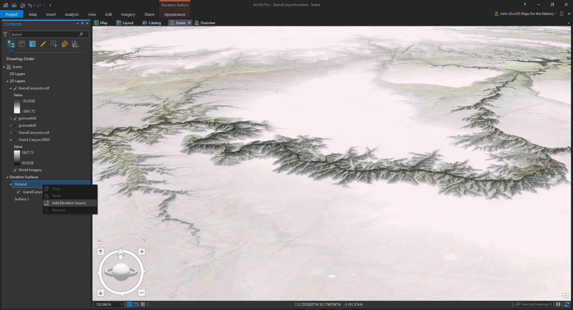 It’s still telling us the inconvenient truth of elevation. But we can totally change the data source Pro uses to draw its ups and downs. In the layer section called Elevation Surfaces, there is the default elevation source. Remove that one and right-click the “Ground” group to point to your freshly-saved inverted DEM image.