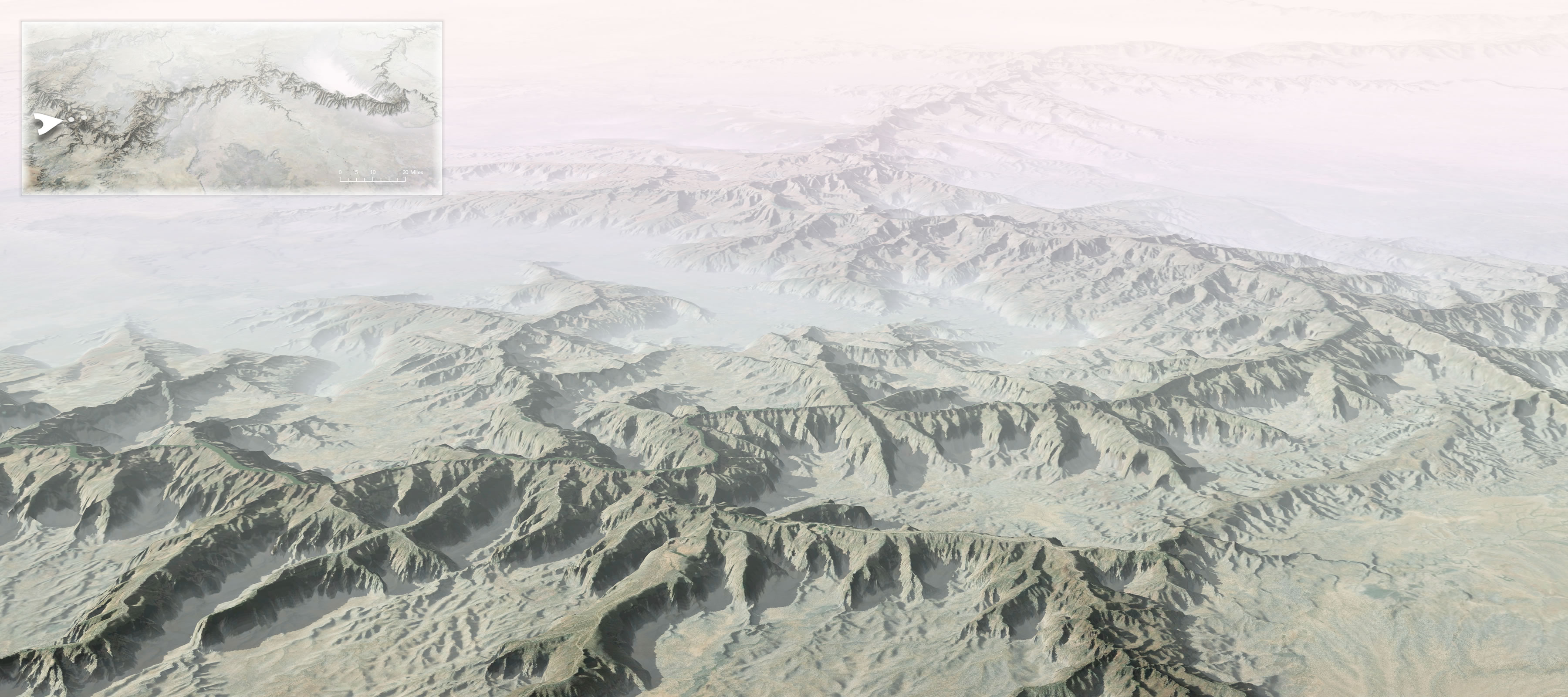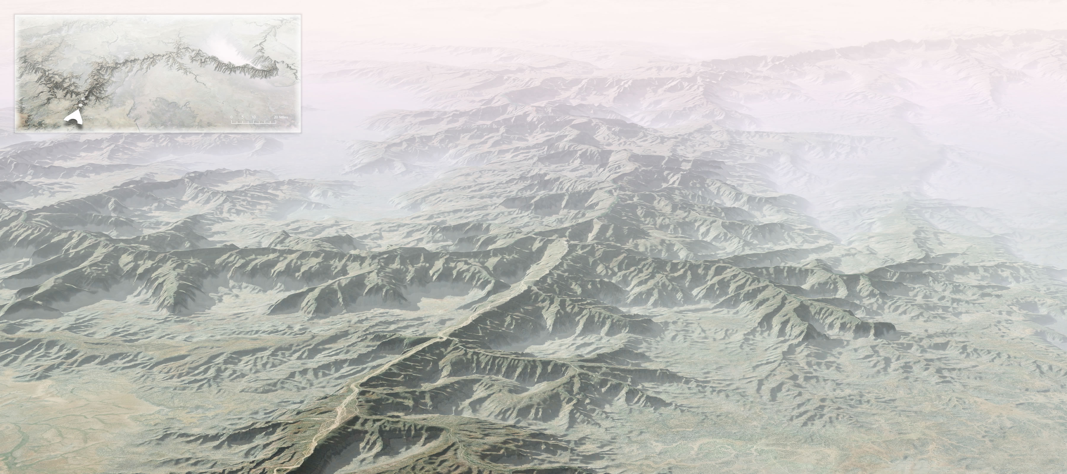 So I thought it was important for my maps that the true (though inverted) vertical elevation of the canyon be shown. But in a small overview map I turned the vertical exaggeration up to 4x to help viewers pick out the map’s perspective from the overall area.